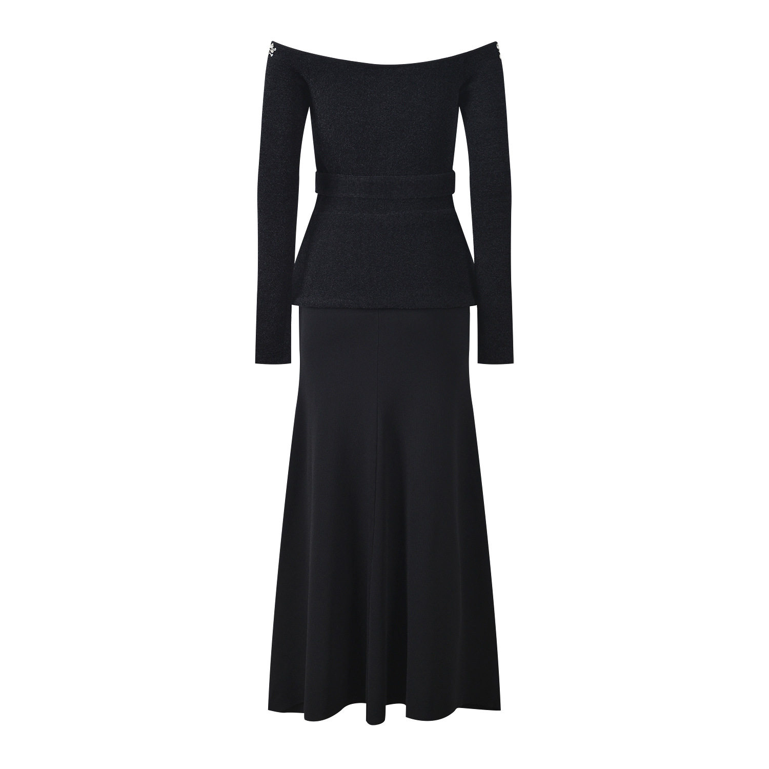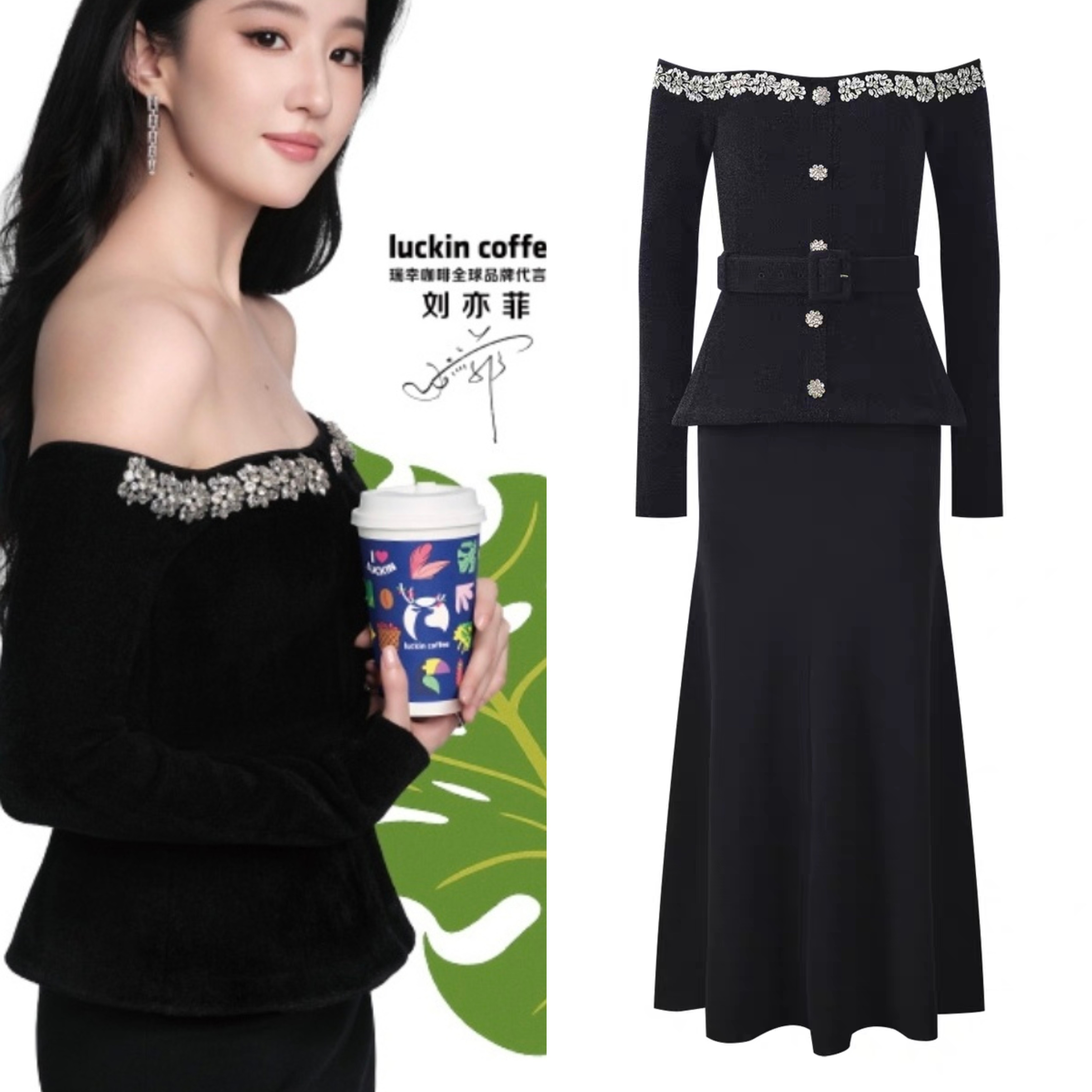 📚 高端现货刘亦菲同款法式一字肩钻饰收腰显瘦长款连衣裙宴会礼服