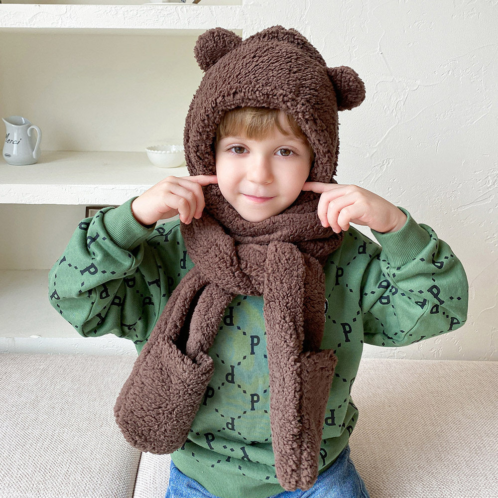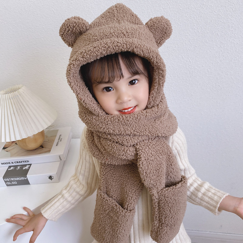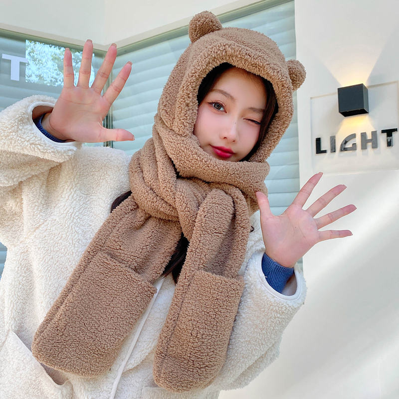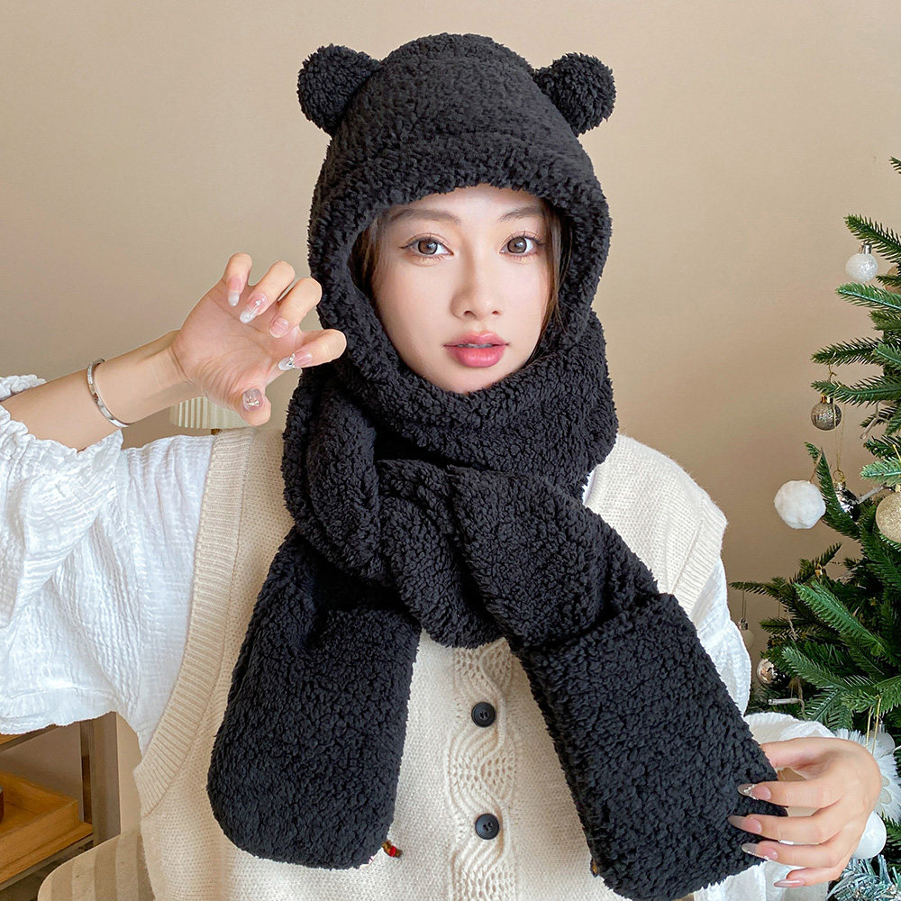 📚 学生帽子女冬小熊耳帽子围巾一体保暖毛绒套头帽骑车防寒加绒围脖