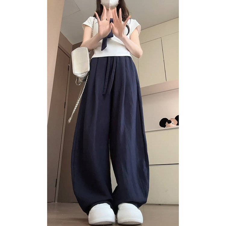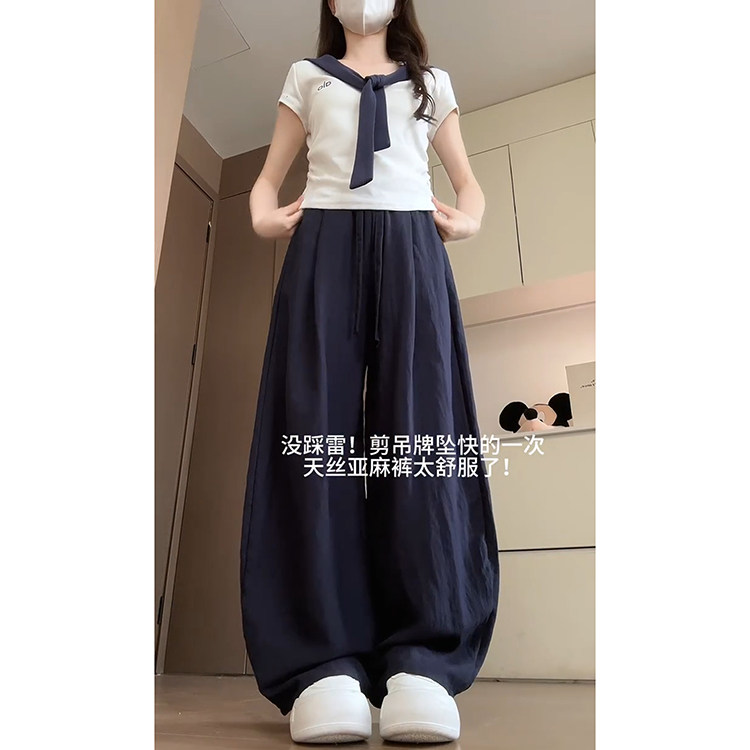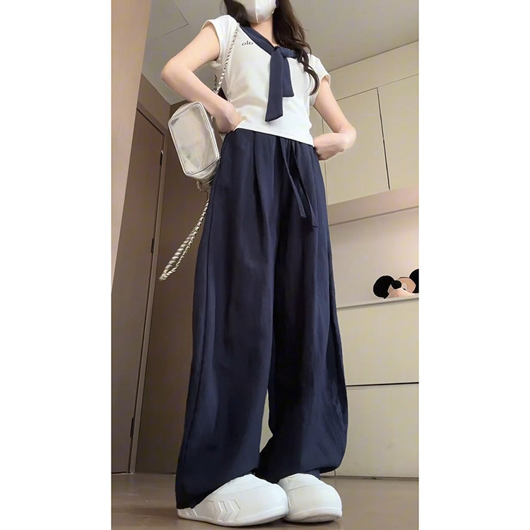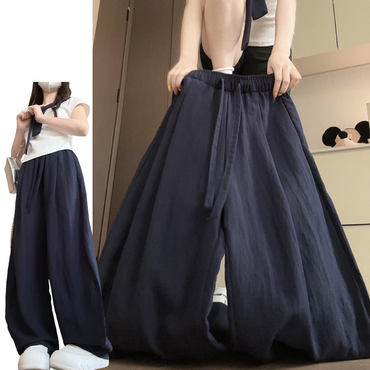 📚 藏青色直筒高腰弯刀裤女夏季2025新款显瘦阔腿垂感亚麻韩系休闲裤