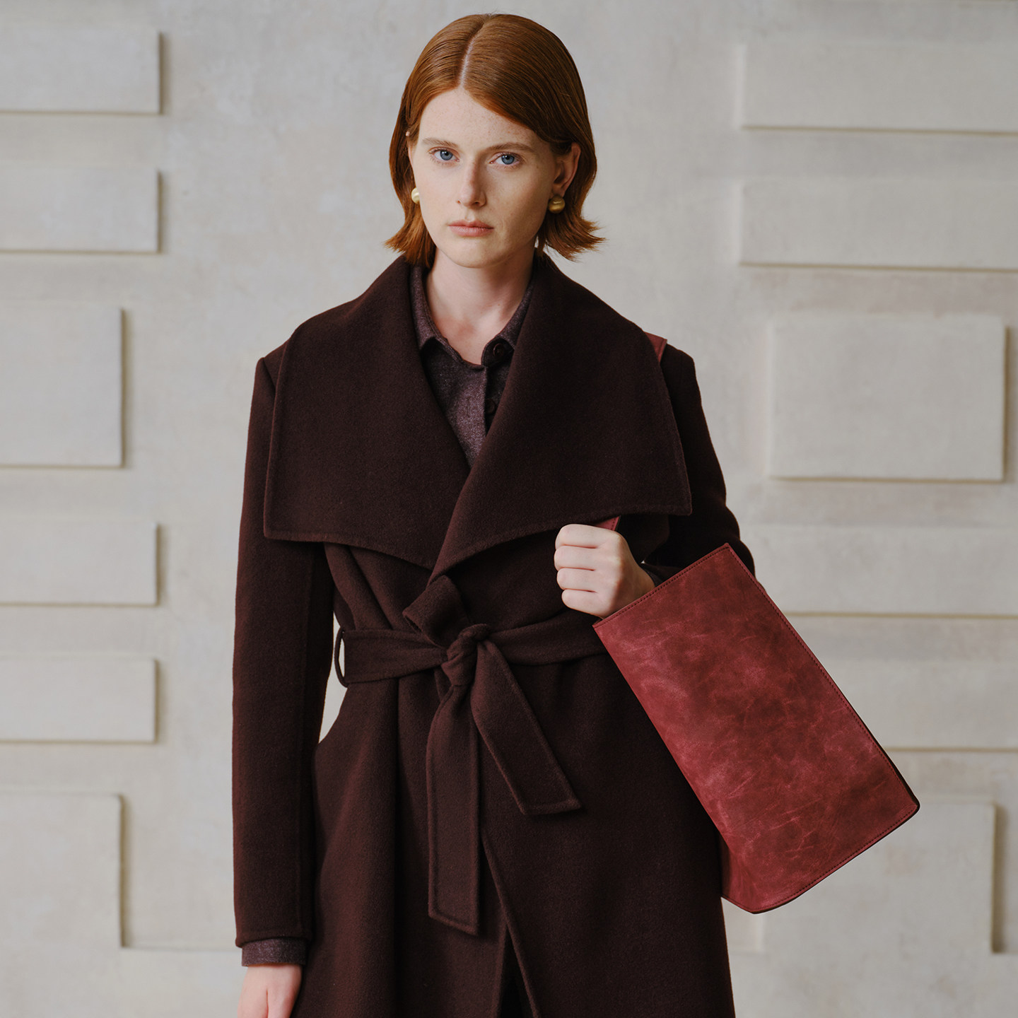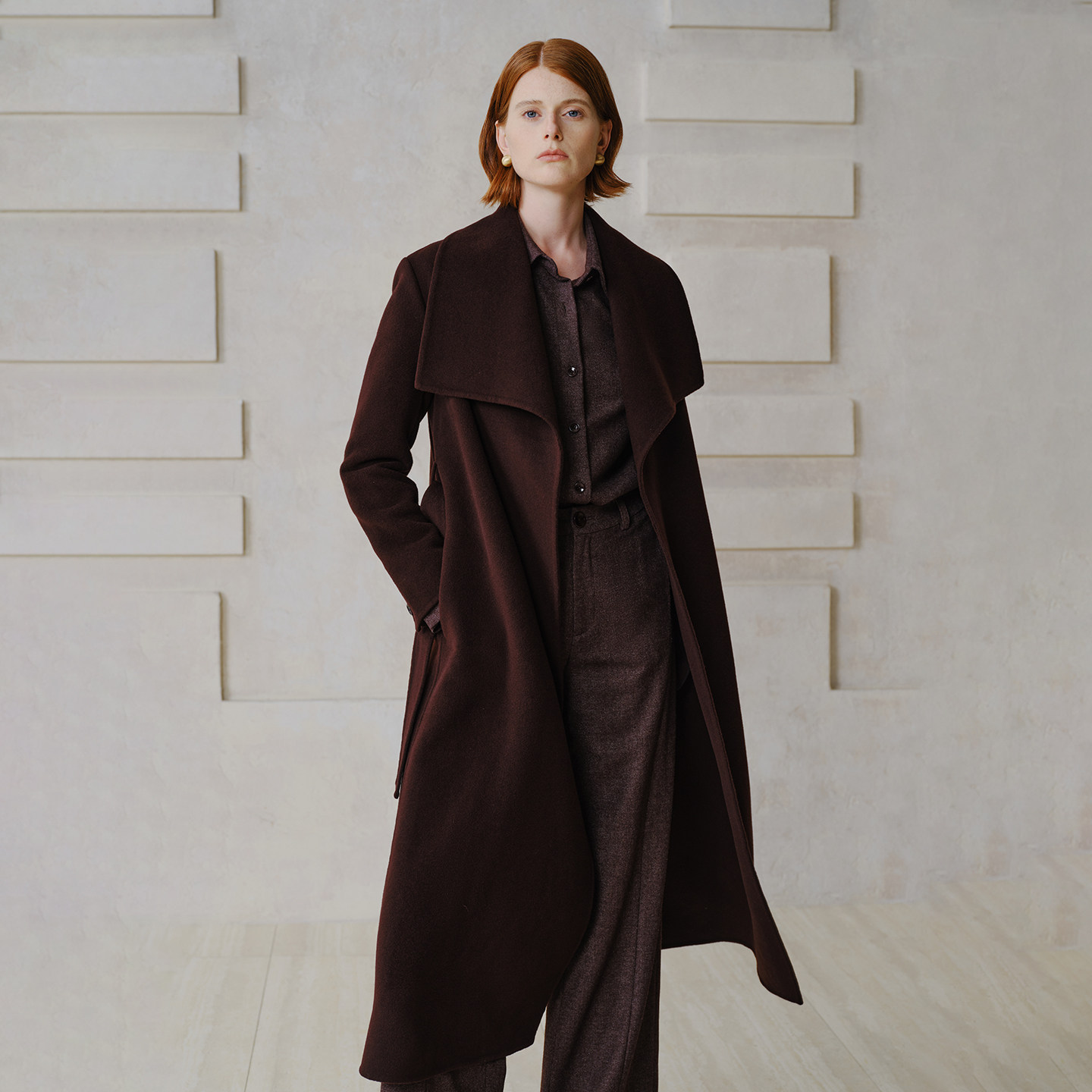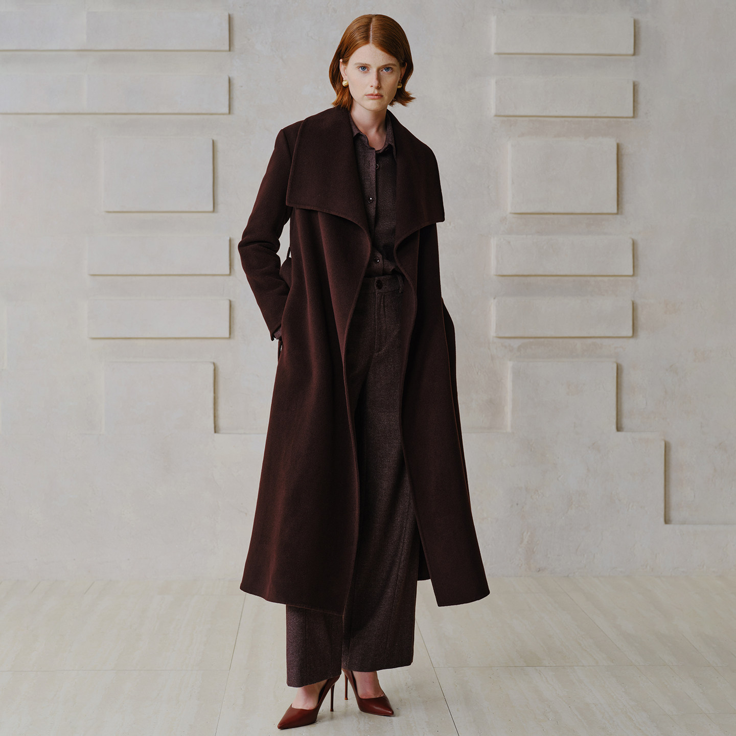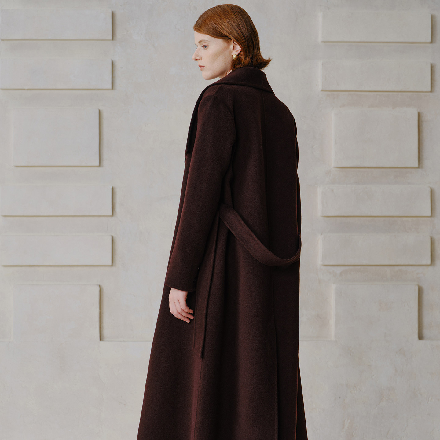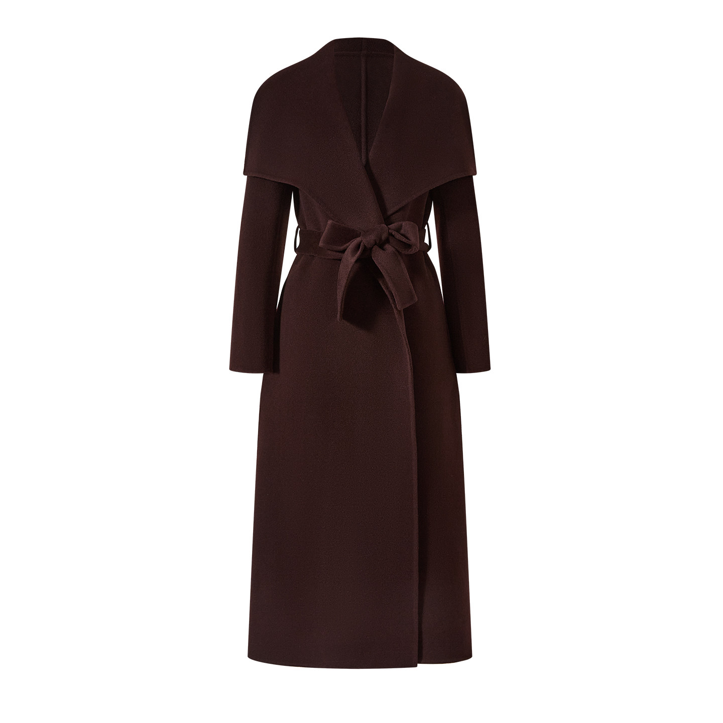 📚 【设计师联名款】酒红色羊绒大翻领长款大衣 秋冬气质羊毛呢外套