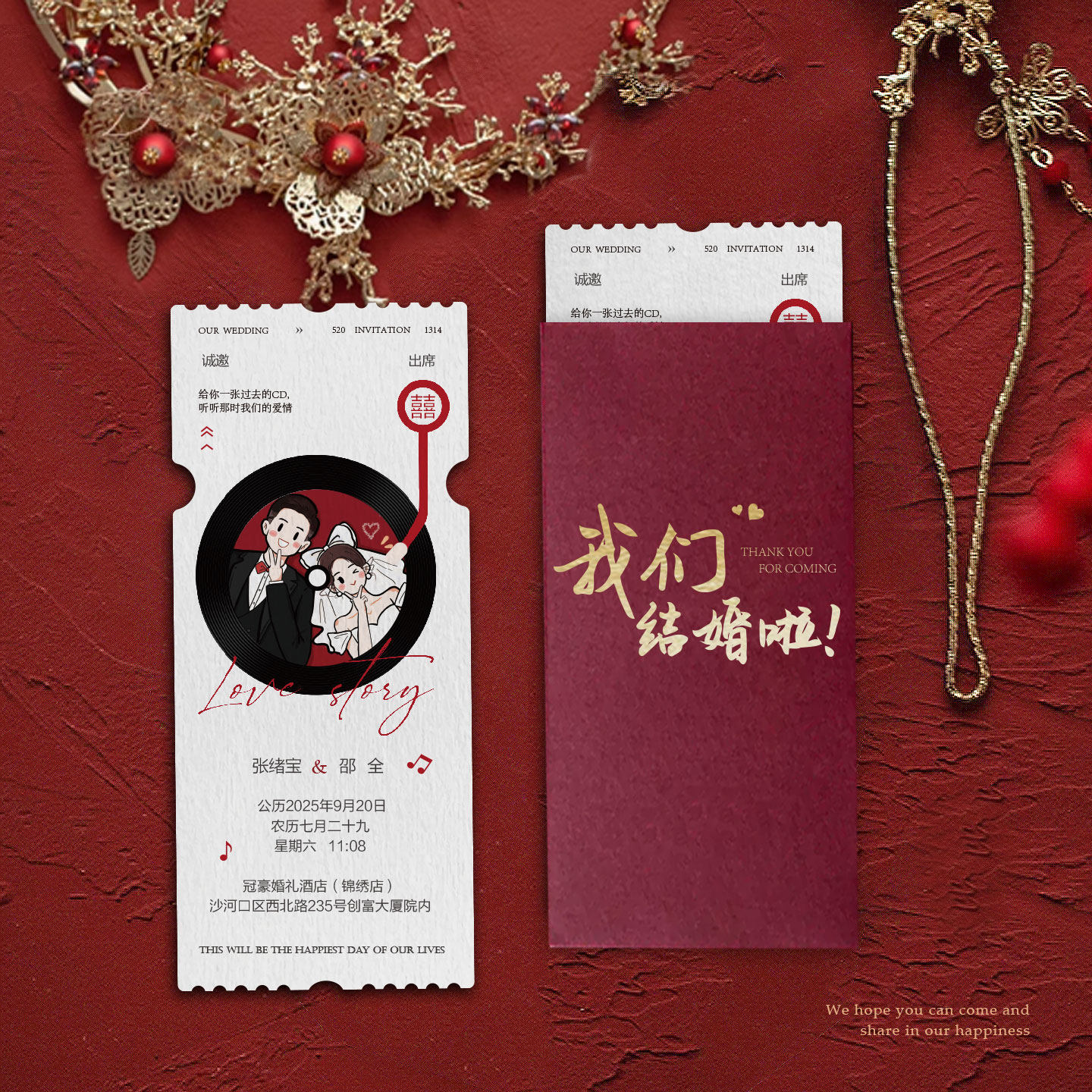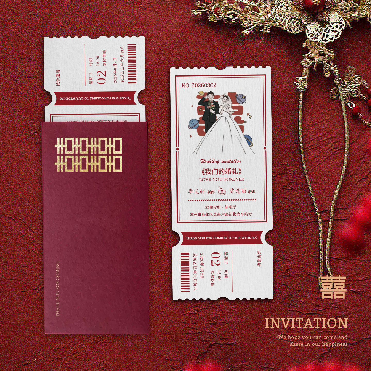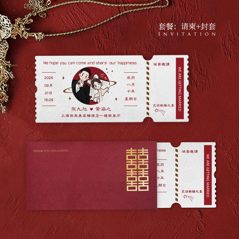 📚 电影票喜帖高级婚宴请贴喜宴请帖结婚邀请函定制纸质创意婚礼请柬