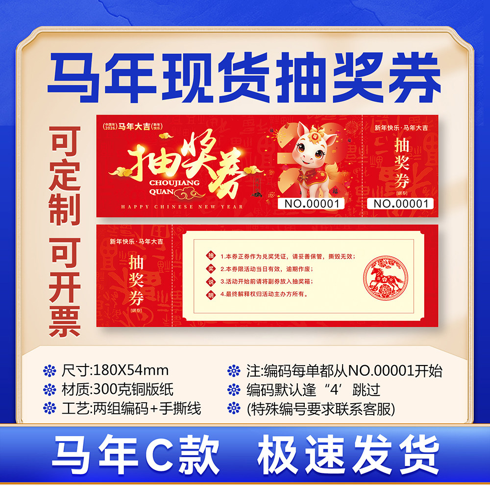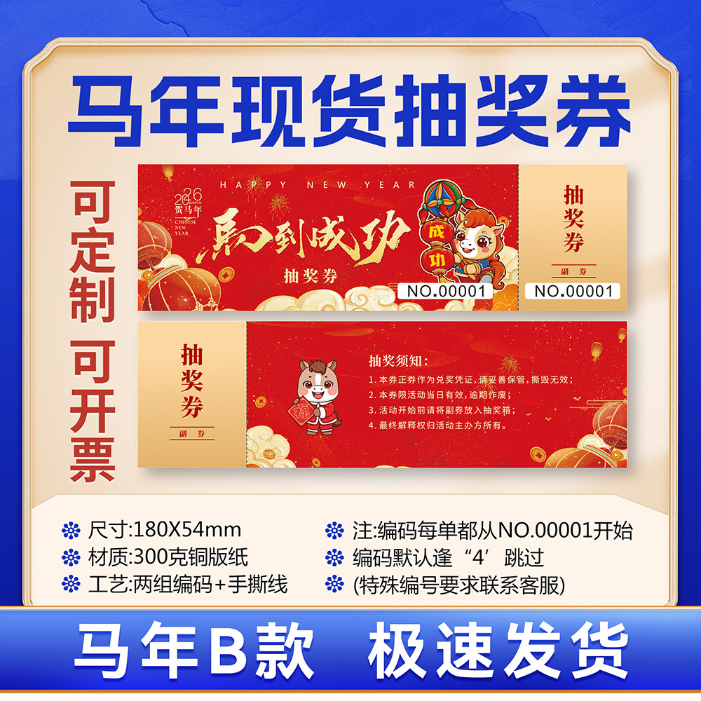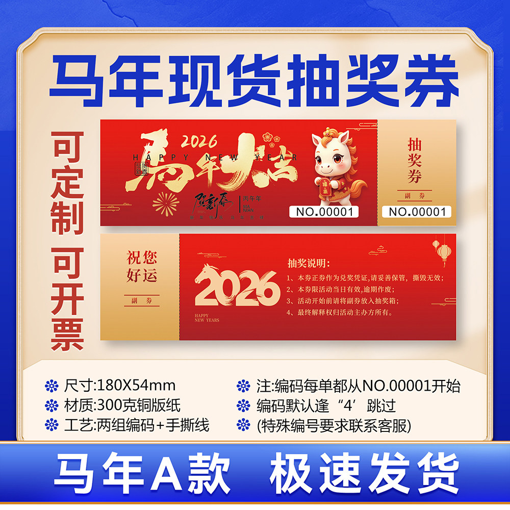 📚 2026马年年会抽奖券现货定制入场券编号手撕线免费设计卡片定做