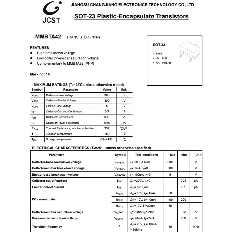 📚 MMBTA42 SOT23贴片 印字1D NPN三极管 晶体管 塑封 0.5A 长电 A42