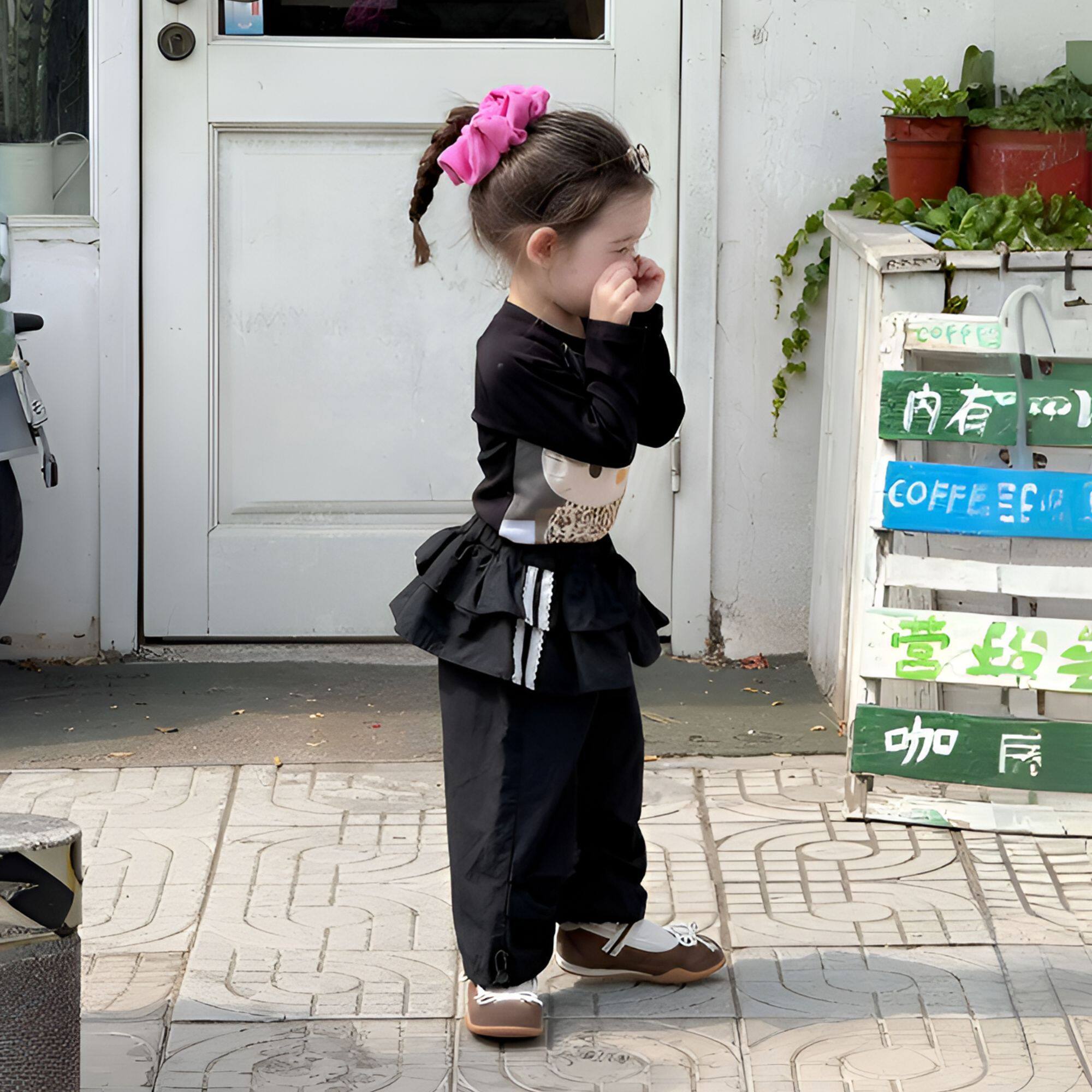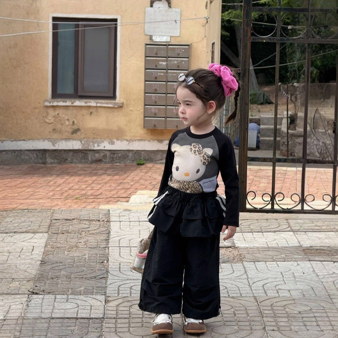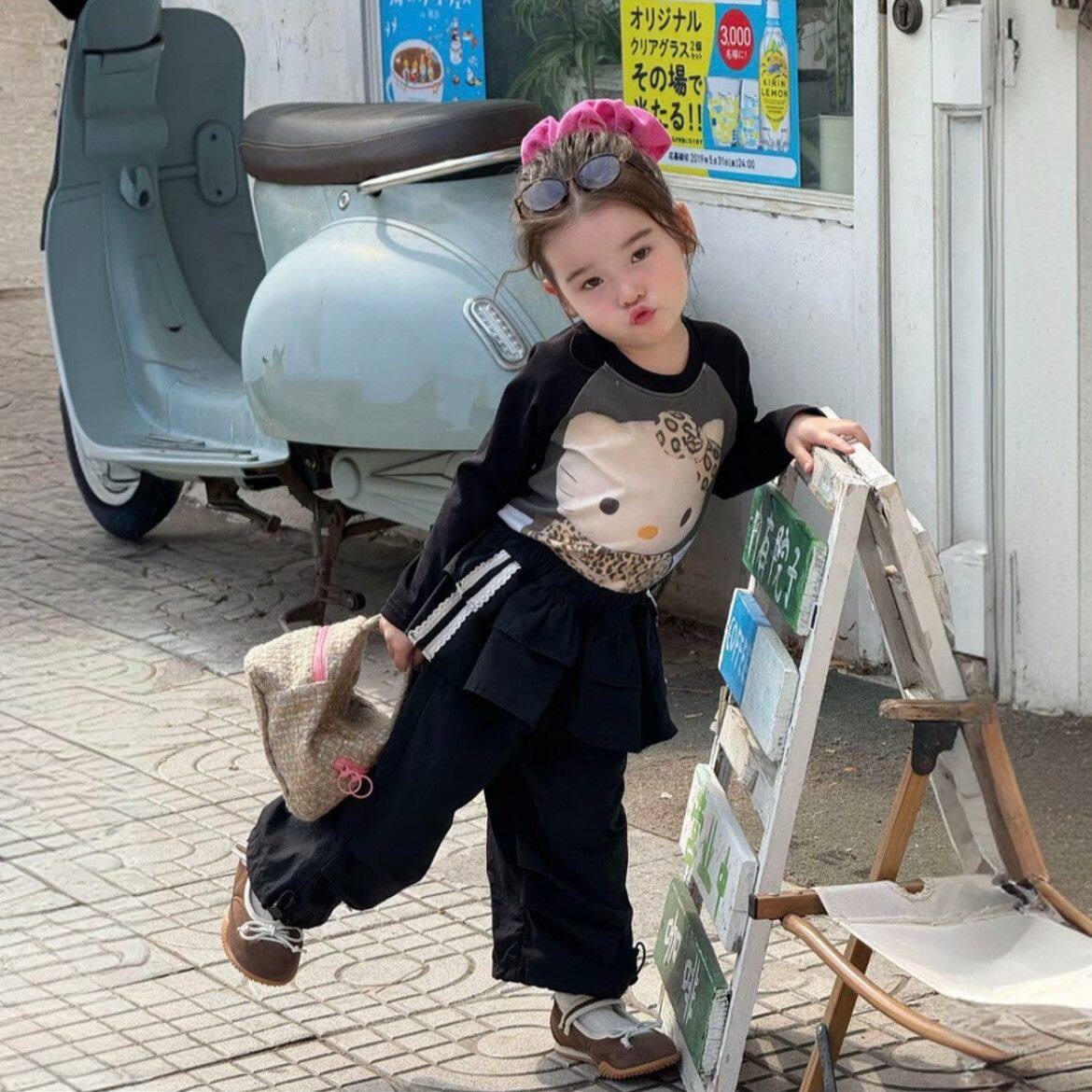📚 女童秋装套装2025新款女宝豹纹Kt猫印花打底上衣荷叶边休闲工装裤