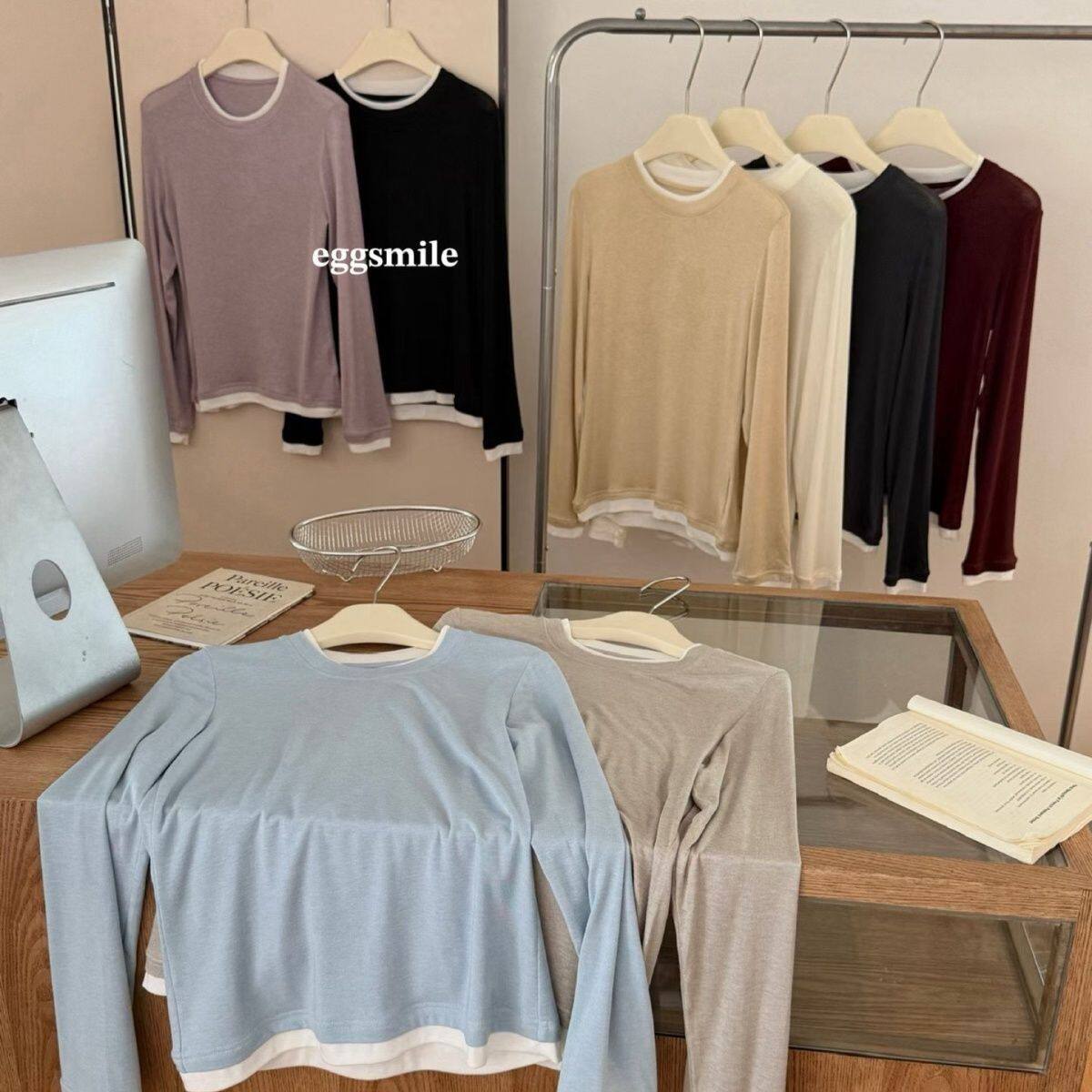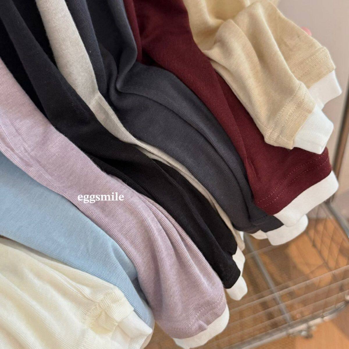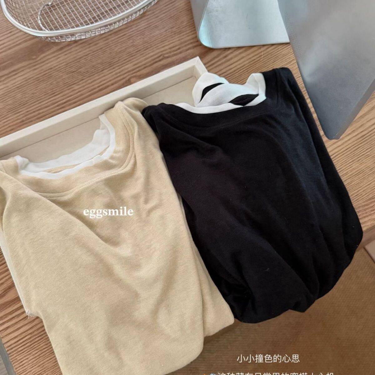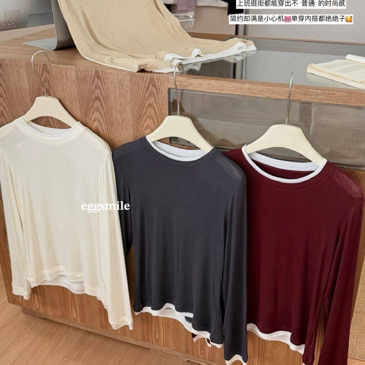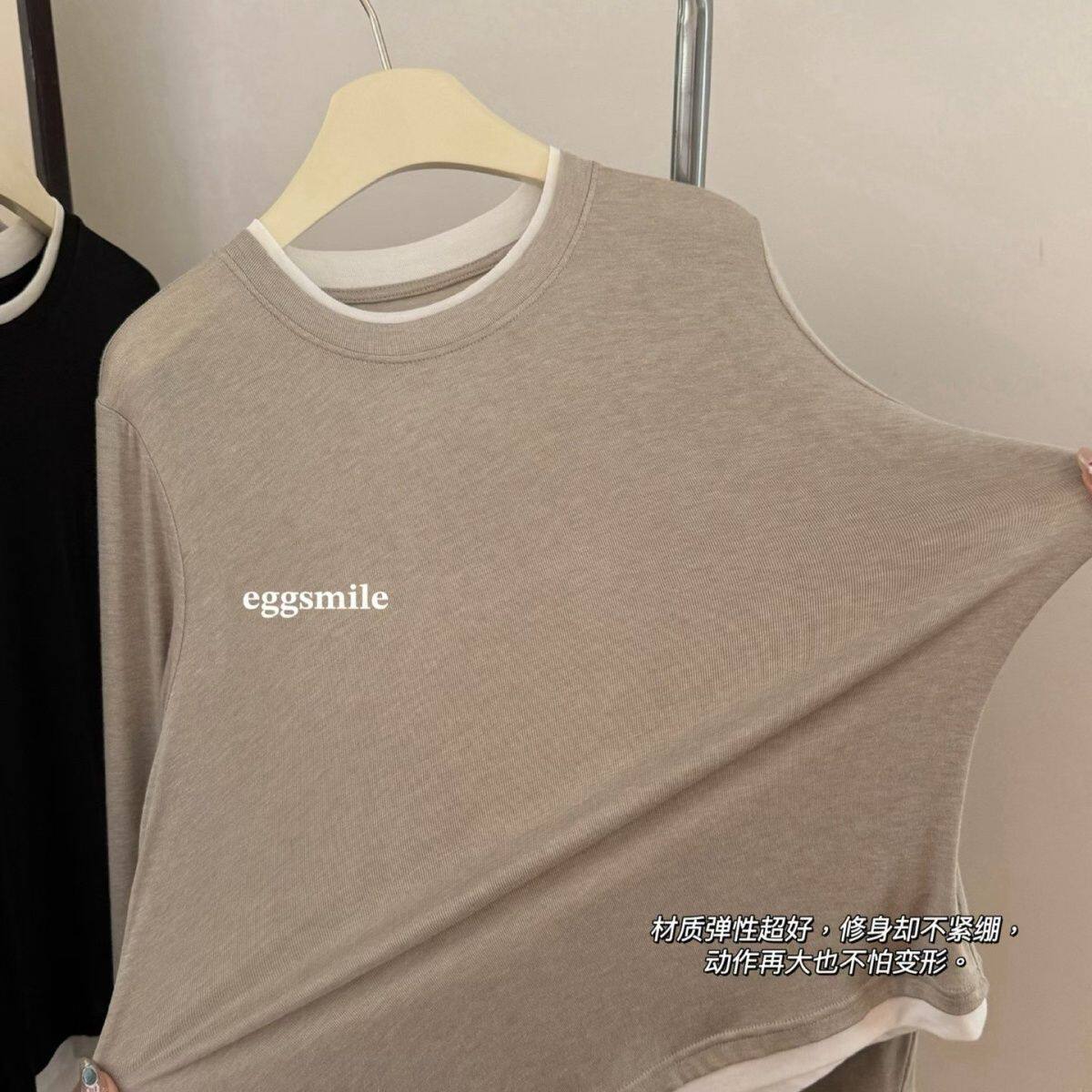 📚 新款egg天丝羊毛假两件长袖打底衫圆领T恤修身显瘦撞色上衣女