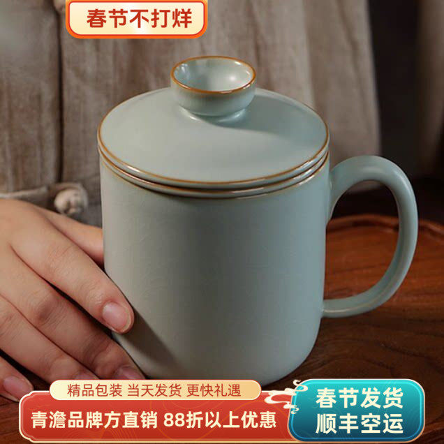 📚 汝窑青澹办公杯陶瓷带盖过滤功夫茶泡茶水杯大容量景德镇青瓷礼品
