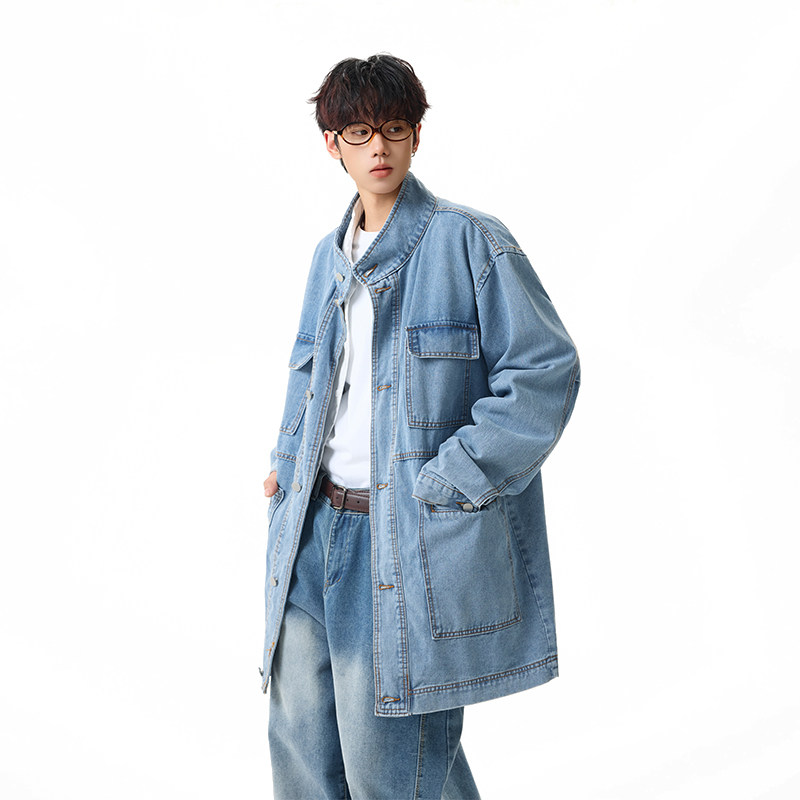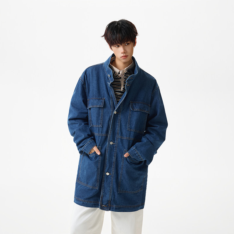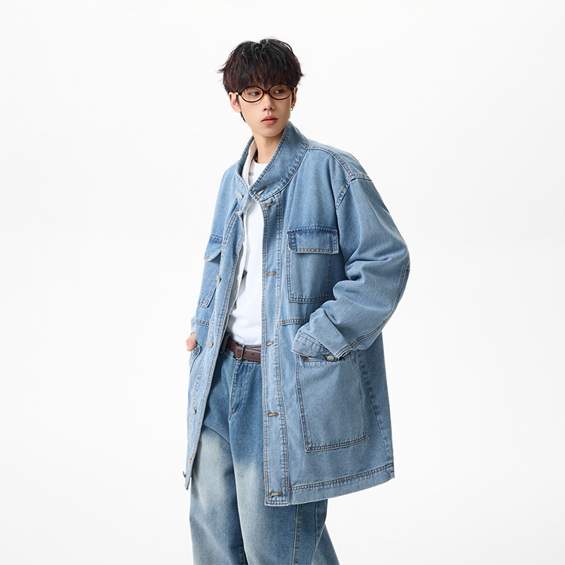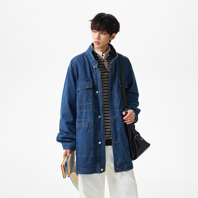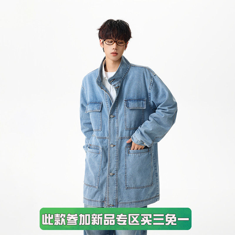 📚 BOYUE帛跃美式中长款工装牛仔外套街头多口袋休闲立领风衣夹克潮