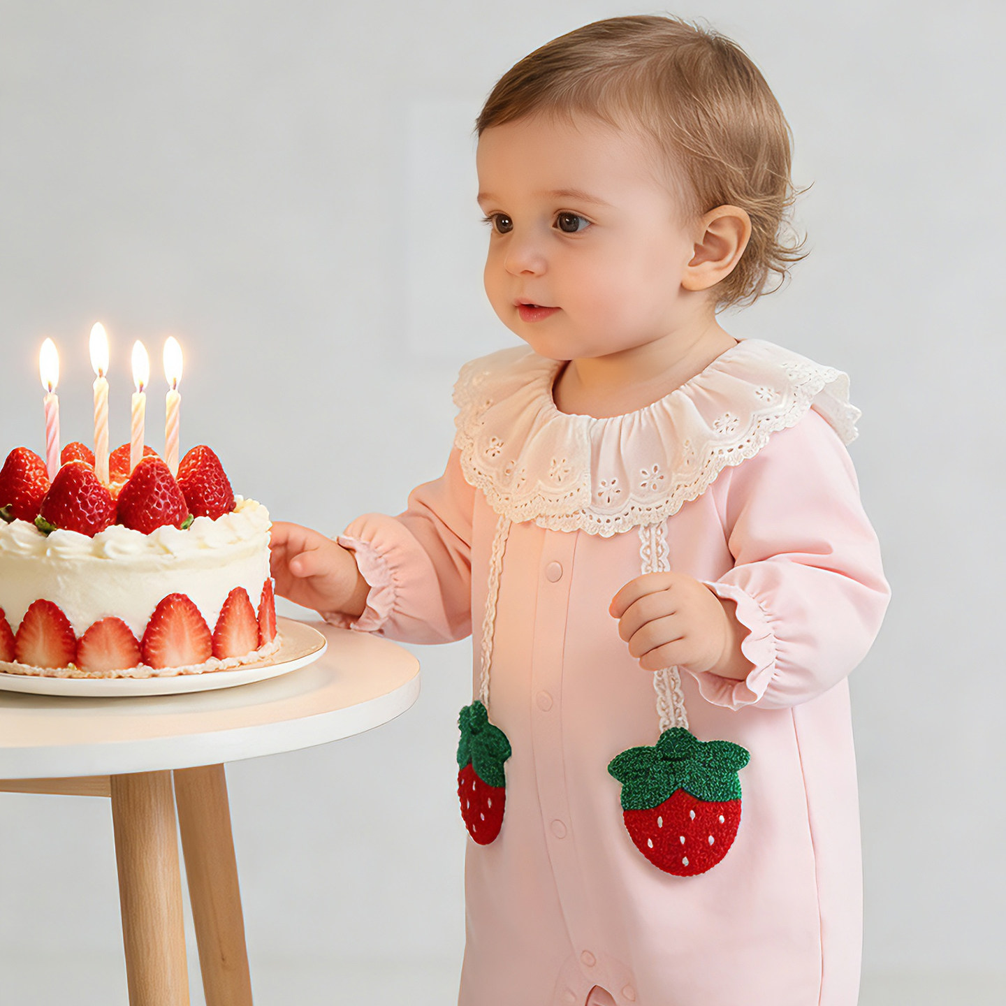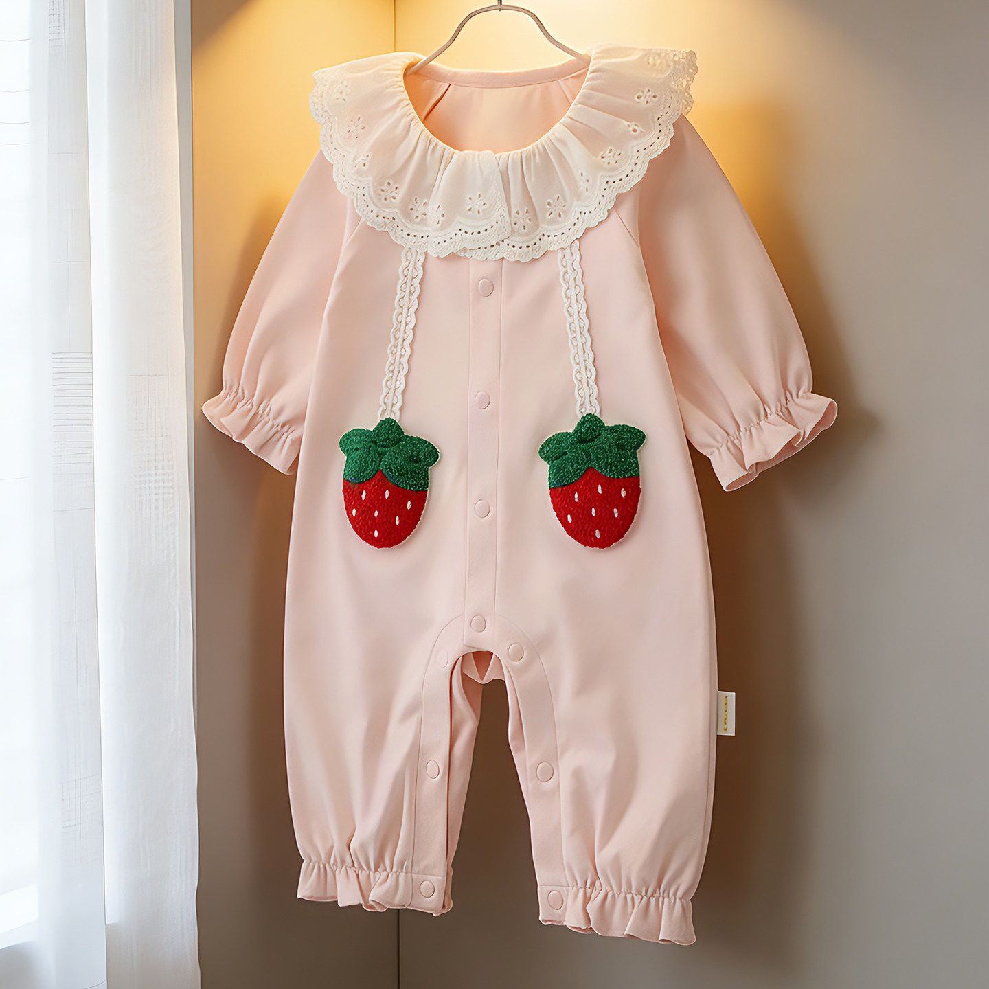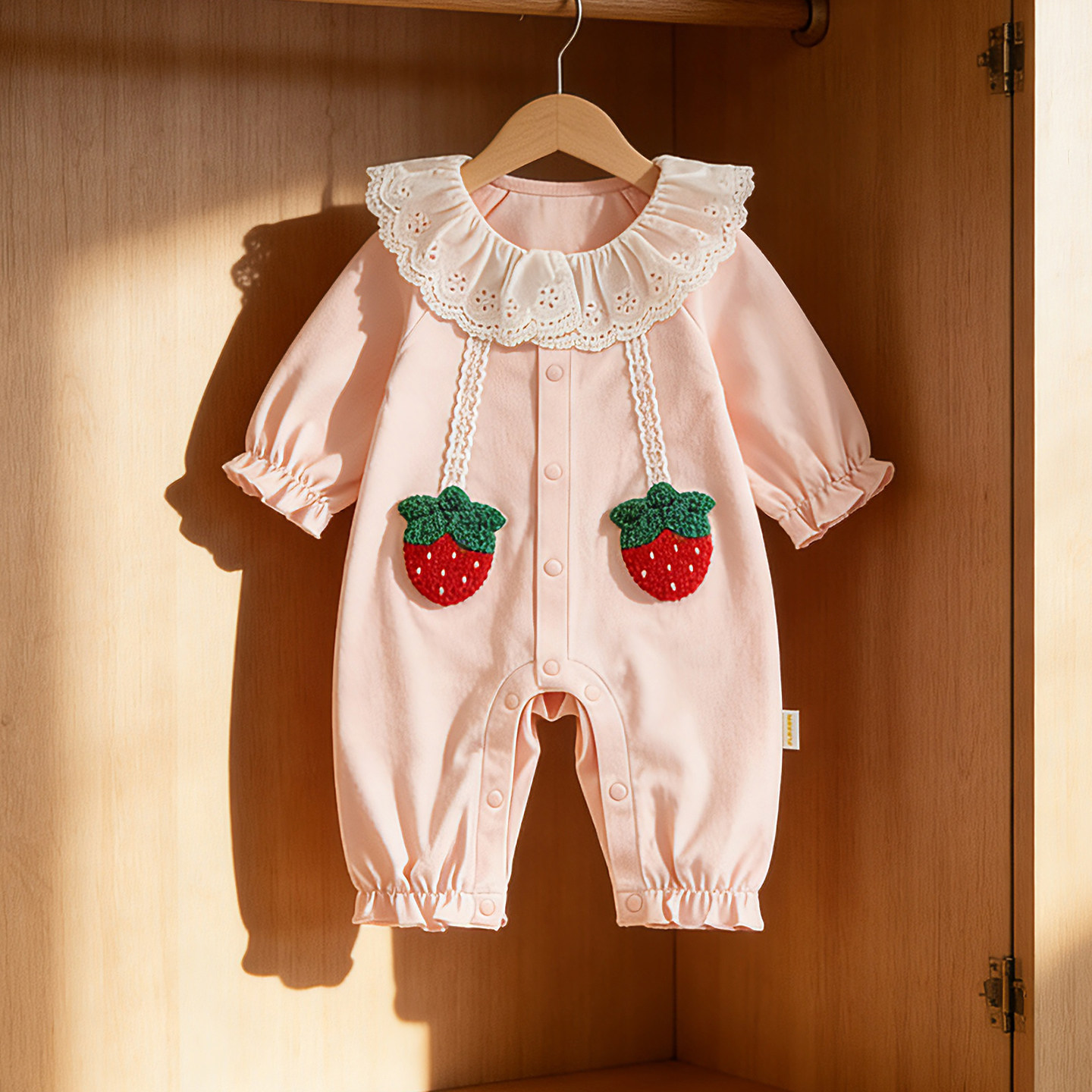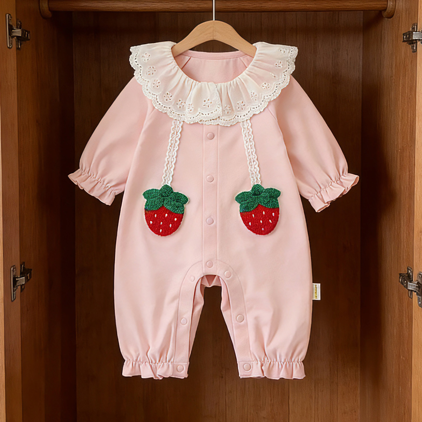 📚 溯格2026新款女宝宝A类甜美连体衣粉草莓婴儿爬服易穿脱66-100码