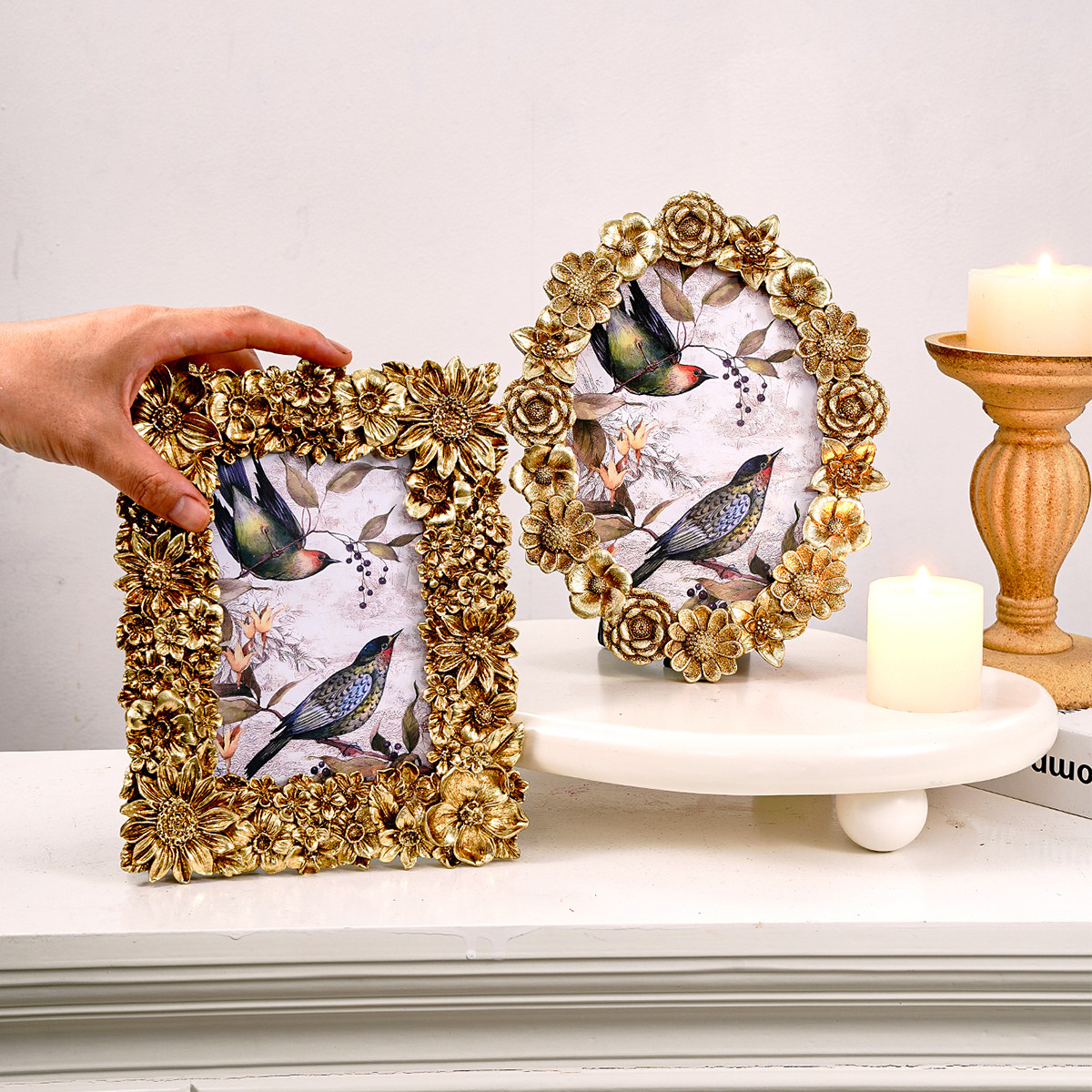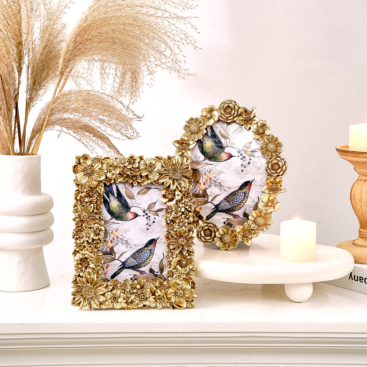 📚 树脂材质创意金色鸟雀花环繁花图案装饰相框家居桌面温馨照片展示