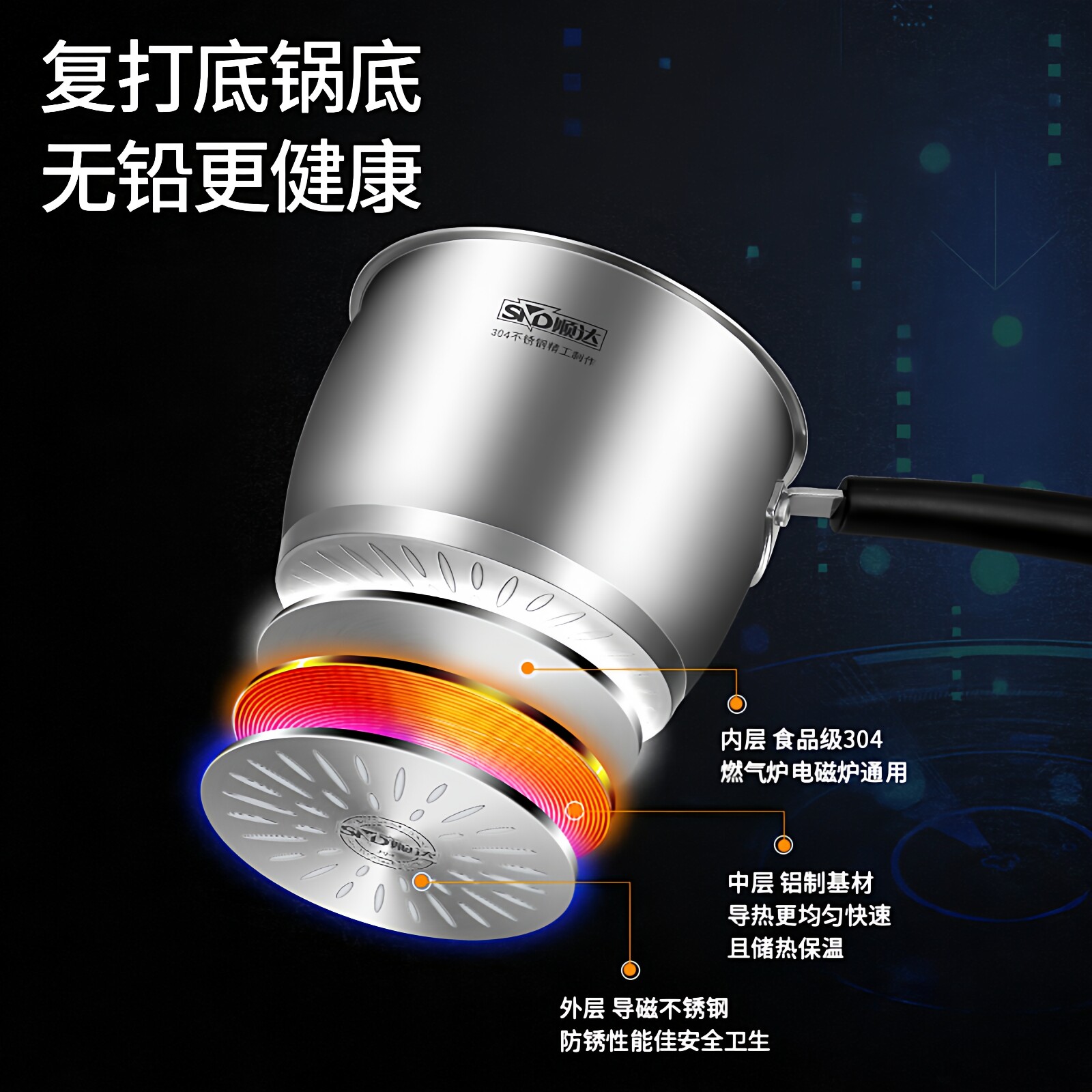 📚 顺达304不锈钢中式奶锅加厚复底小汤锅14/16CM燃气电磁炉通用锅具