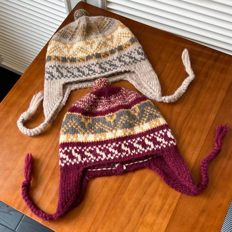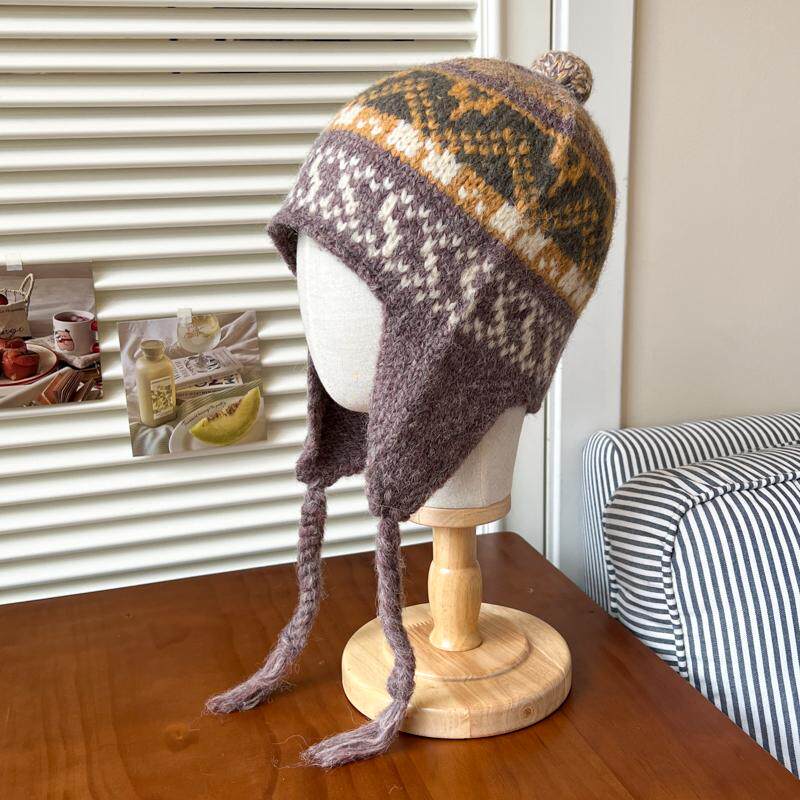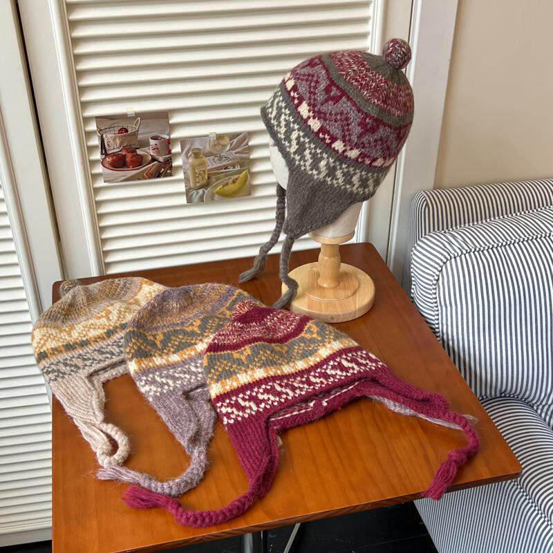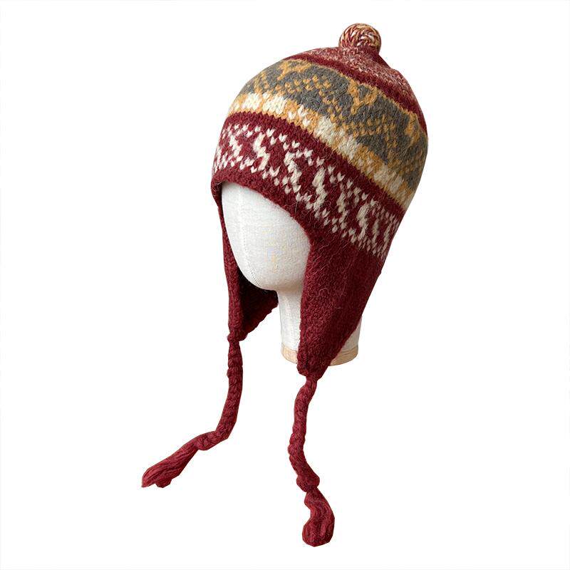 📚 民族风提花混纺冬天毛线帽女生复古红色可爱多彩羊毛保暖护耳帽子