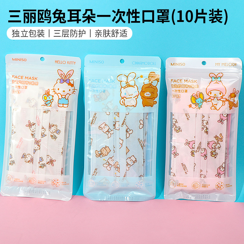 📚 miniso名创优品三丽鸥兔耳朵一次性口罩玉桂狗三层防护夏季薄款