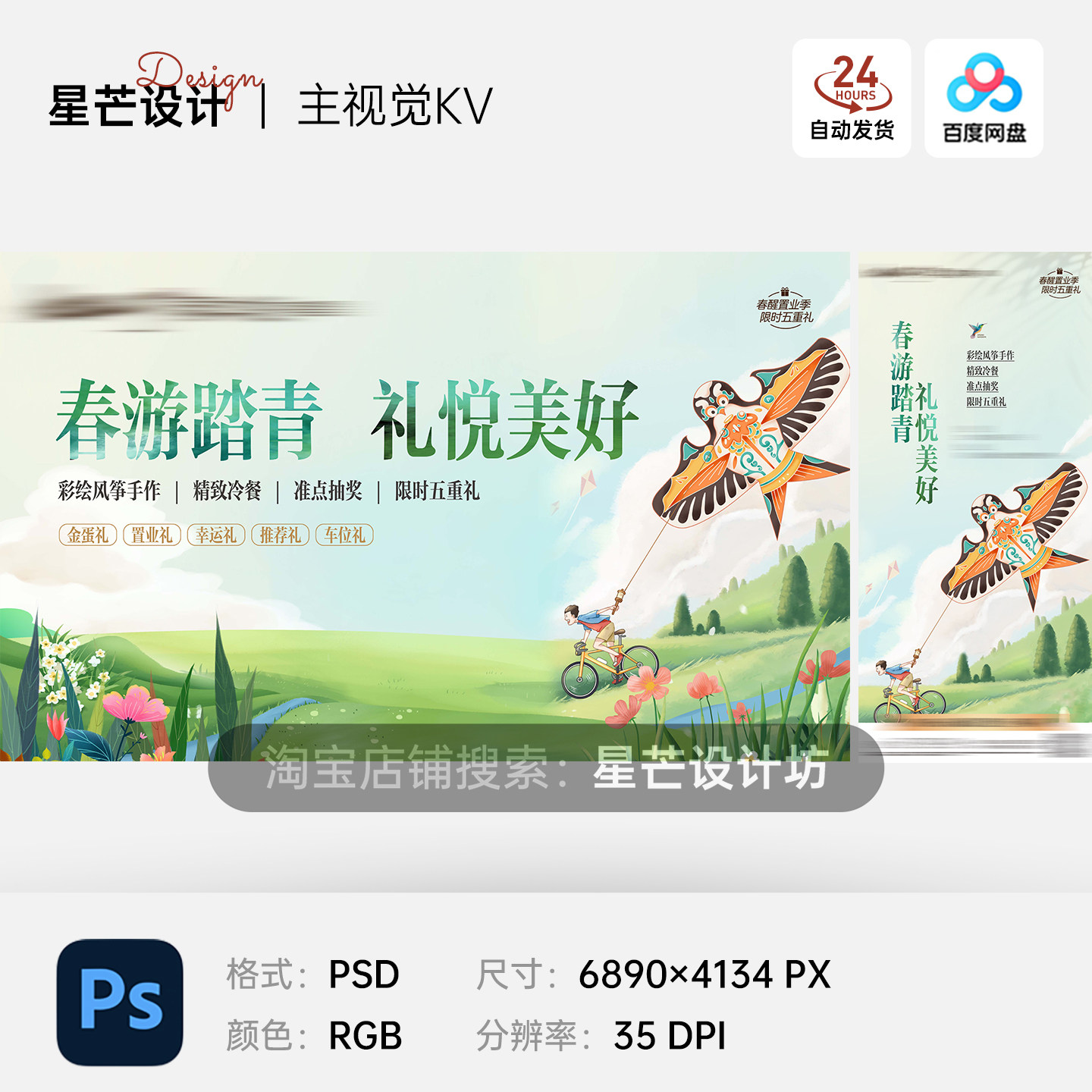 📚 插画卡通风筝春日春天春游踏青赏花地产购房活动主视觉KV展板海报