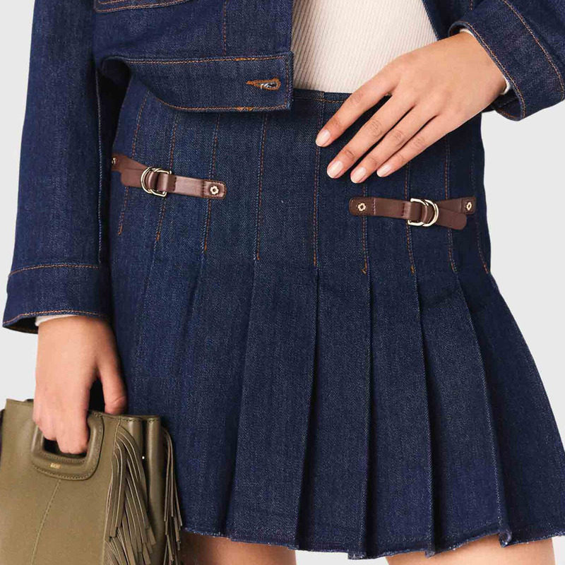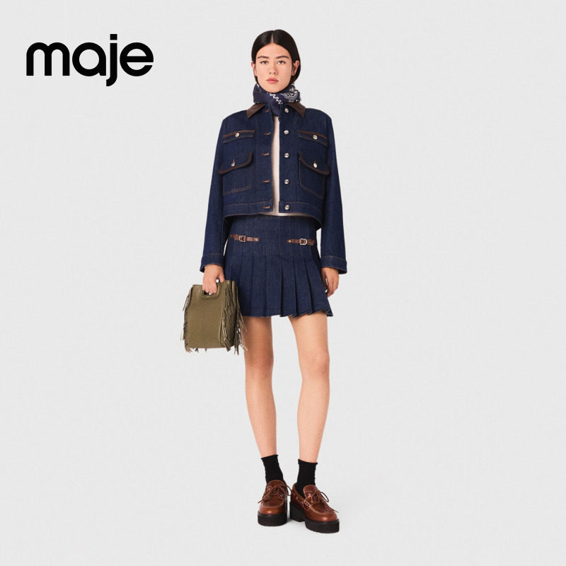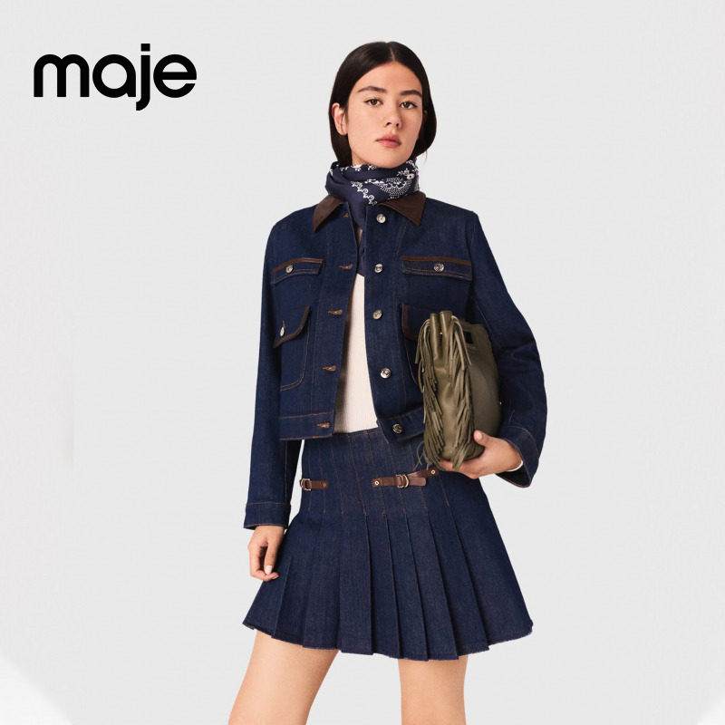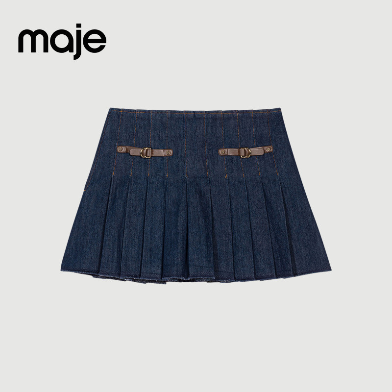 📚 季末7折Maje2025秋冬新款女装复古牛仔棉质蓝色短款百褶半身裙