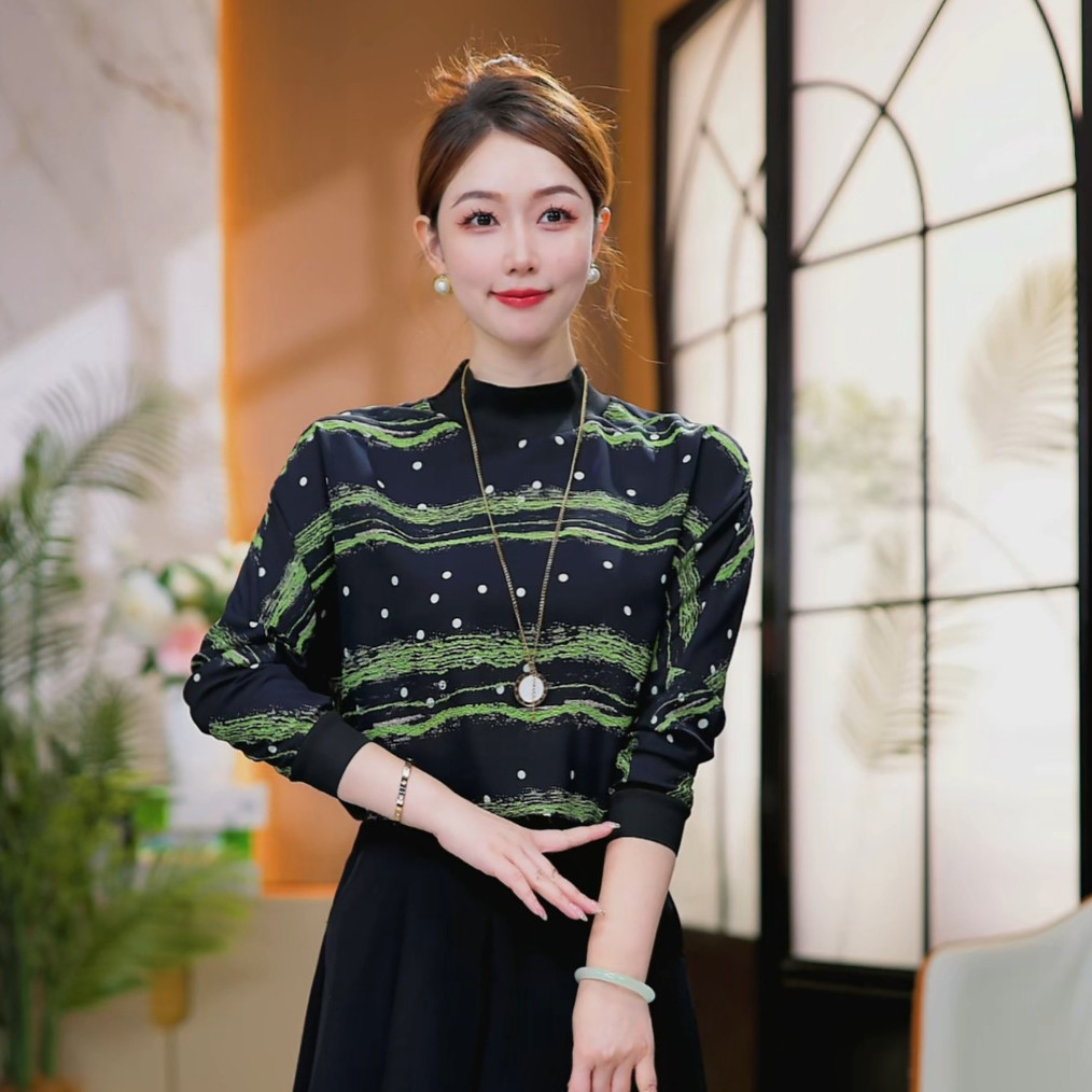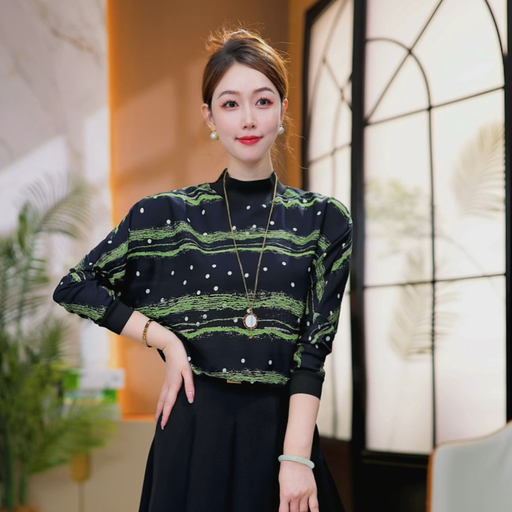 📚 现货 秋风微澜~波点绿色条纹宽松显瘦气质打底衫洋气长袖T恤上衣