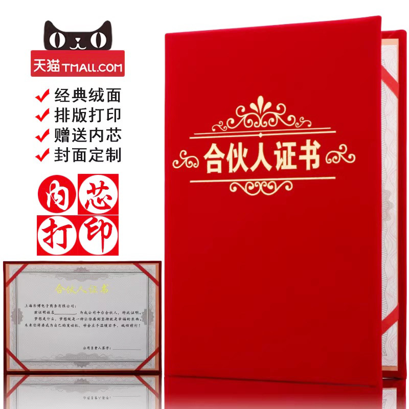 📚 启恒A4红绒面合伙人证书创始股东投资证明书合作入股协议书创业聘书荣誉证书封面外壳烫金订制定做内页可打印