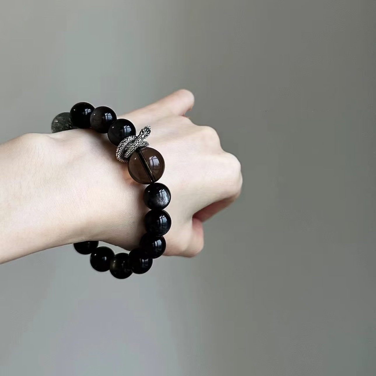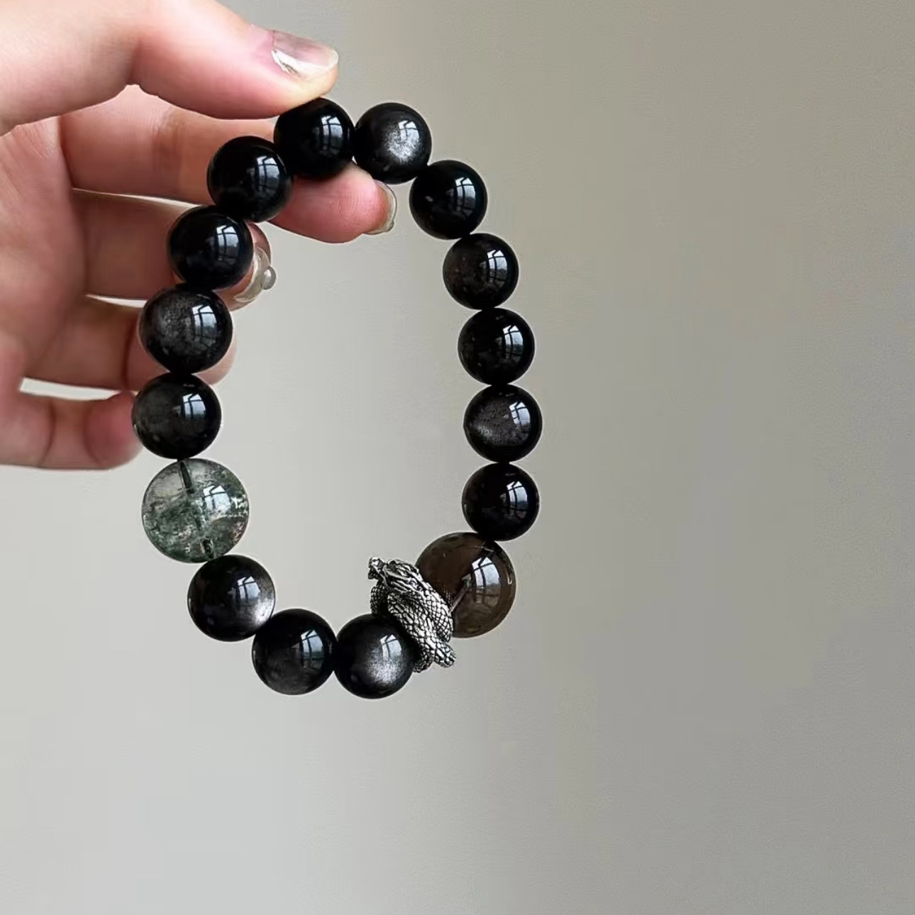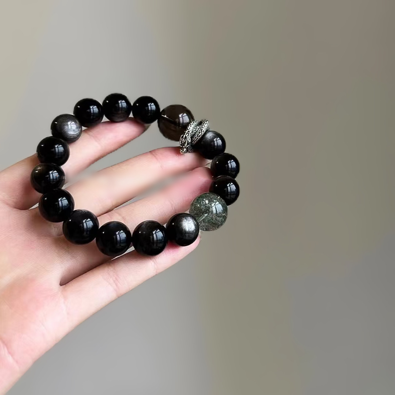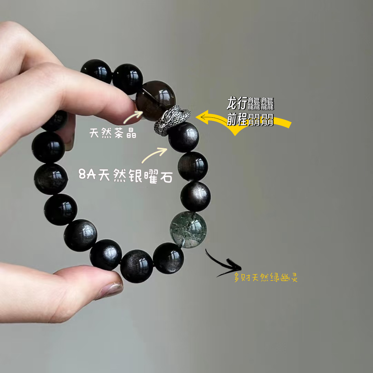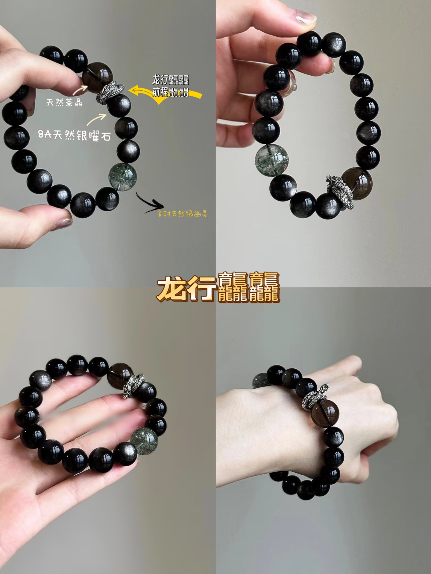 📚 【龙行龘龘】黑色系天然银曜石手链设计感转运情侣礼物简约百搭饰