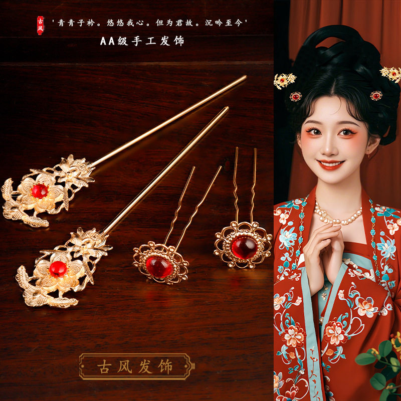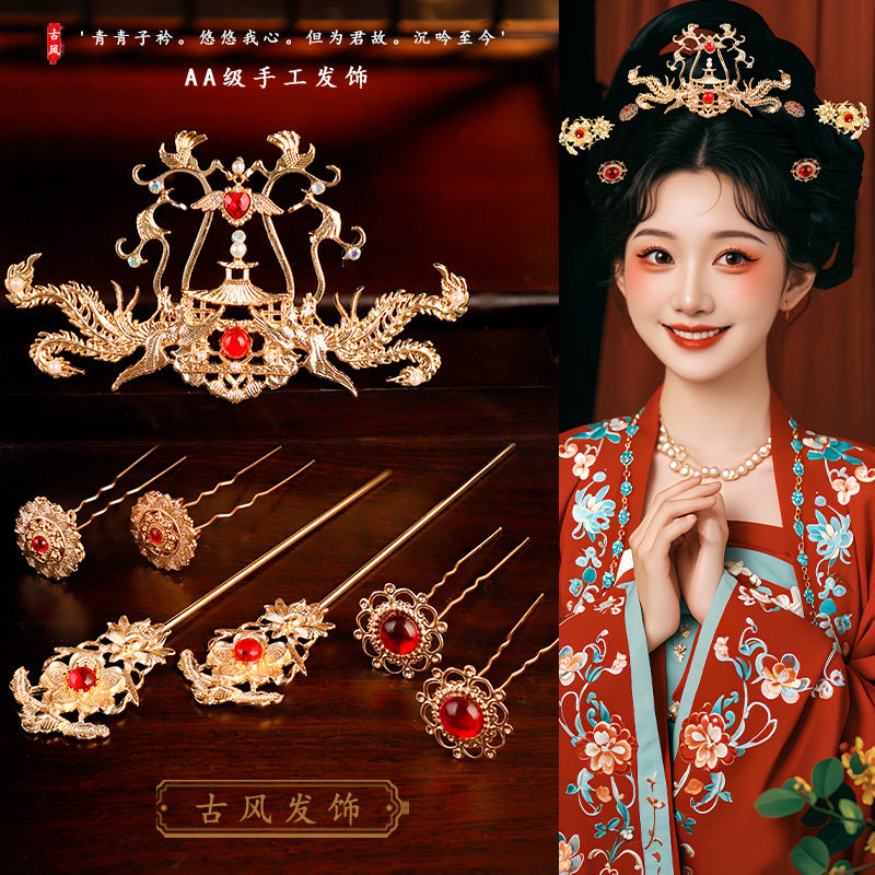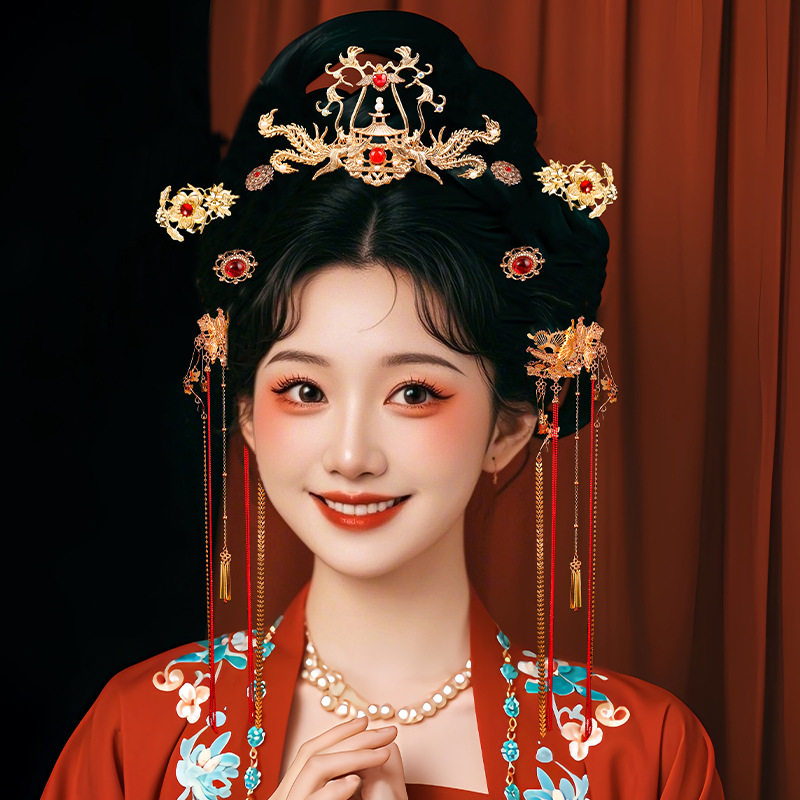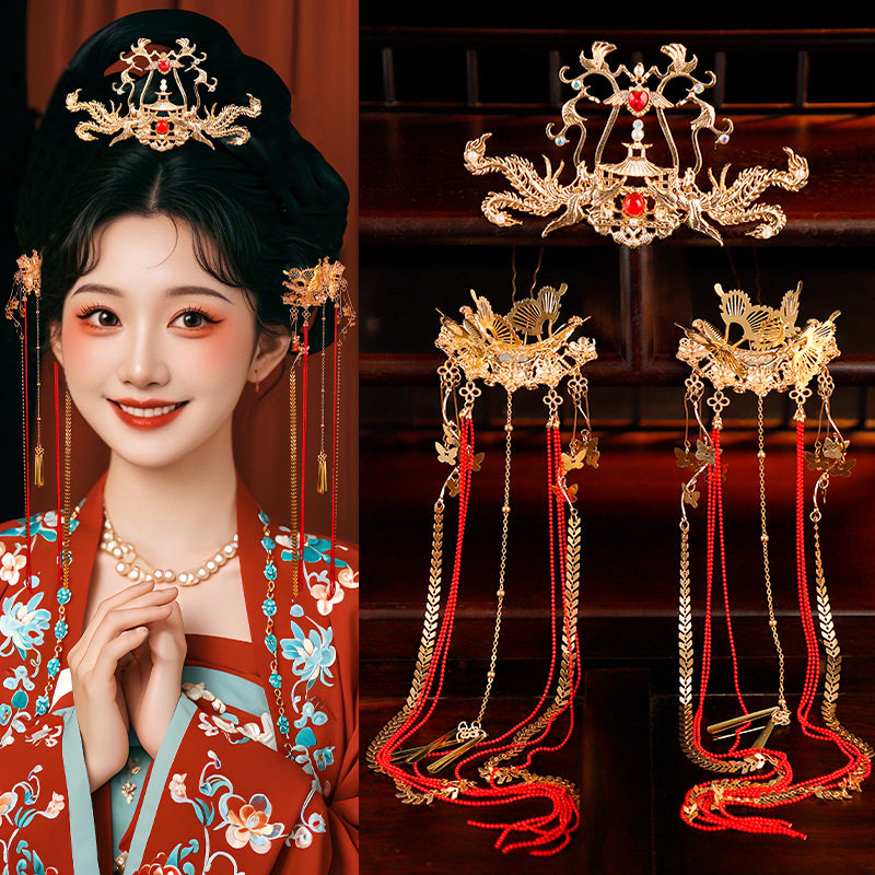📚 汉服红色饰品古风头饰发冠长流苏步摇发簪复古百搭秀禾服新娘发饰