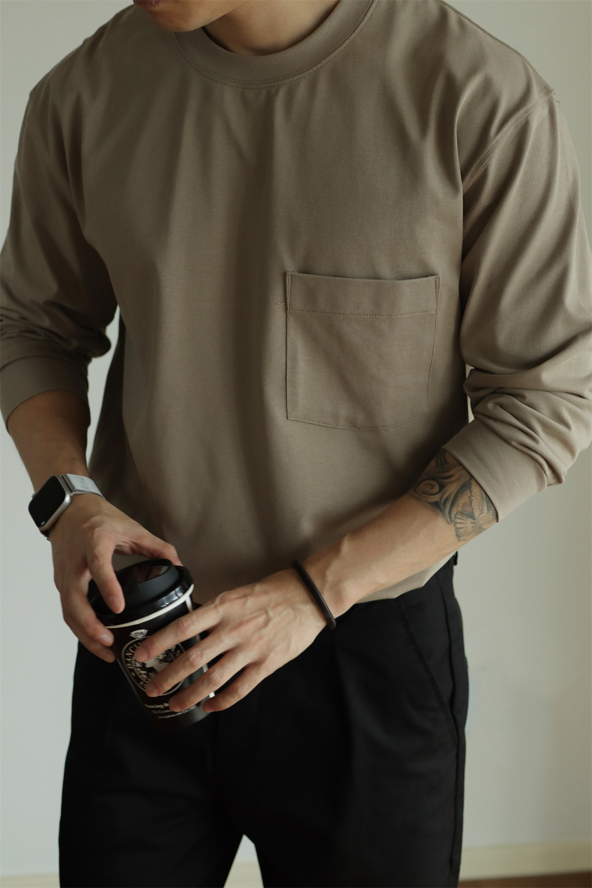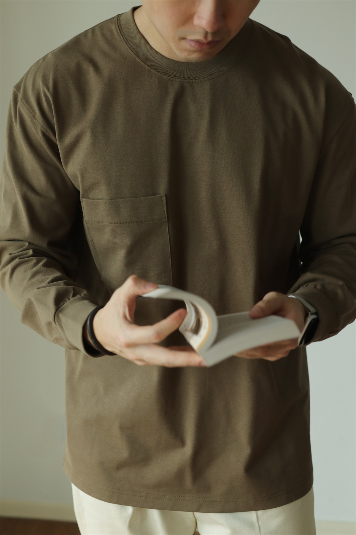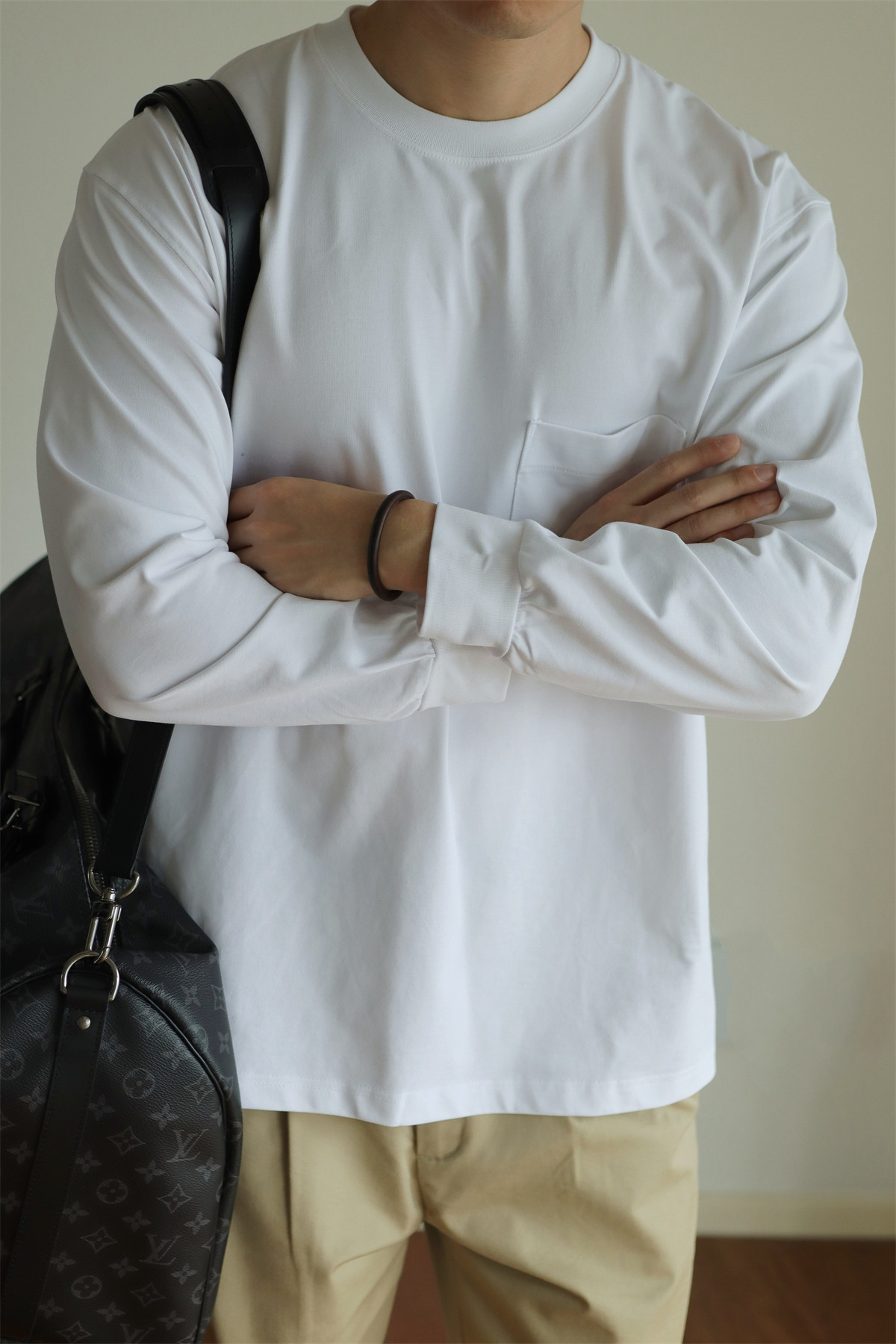 📚 YUXIAN日系Sorona科技抗菌口袋长袖T恤宽松圆领百搭男士纯色春秋