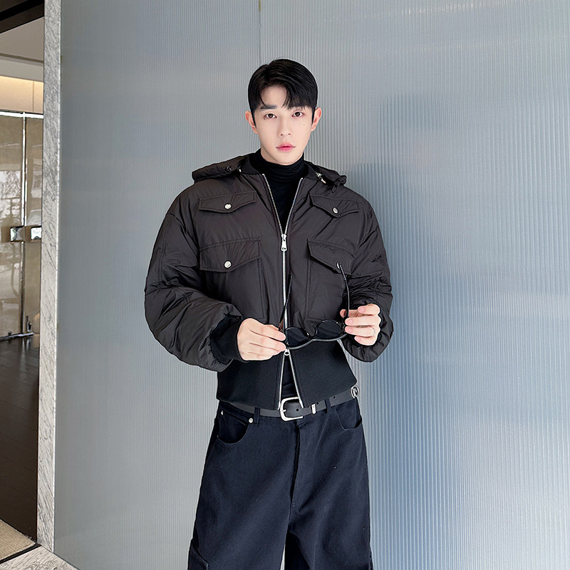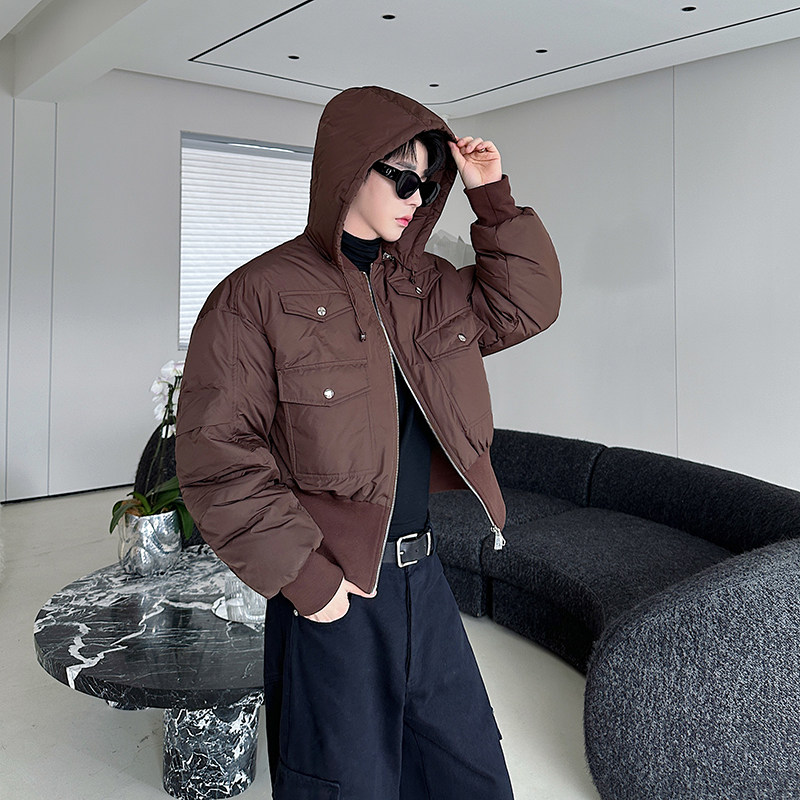 📚 冬季老钱褐色螺纹设计感短款可拆卸带帽羽绒服外套男复古加厚保暖