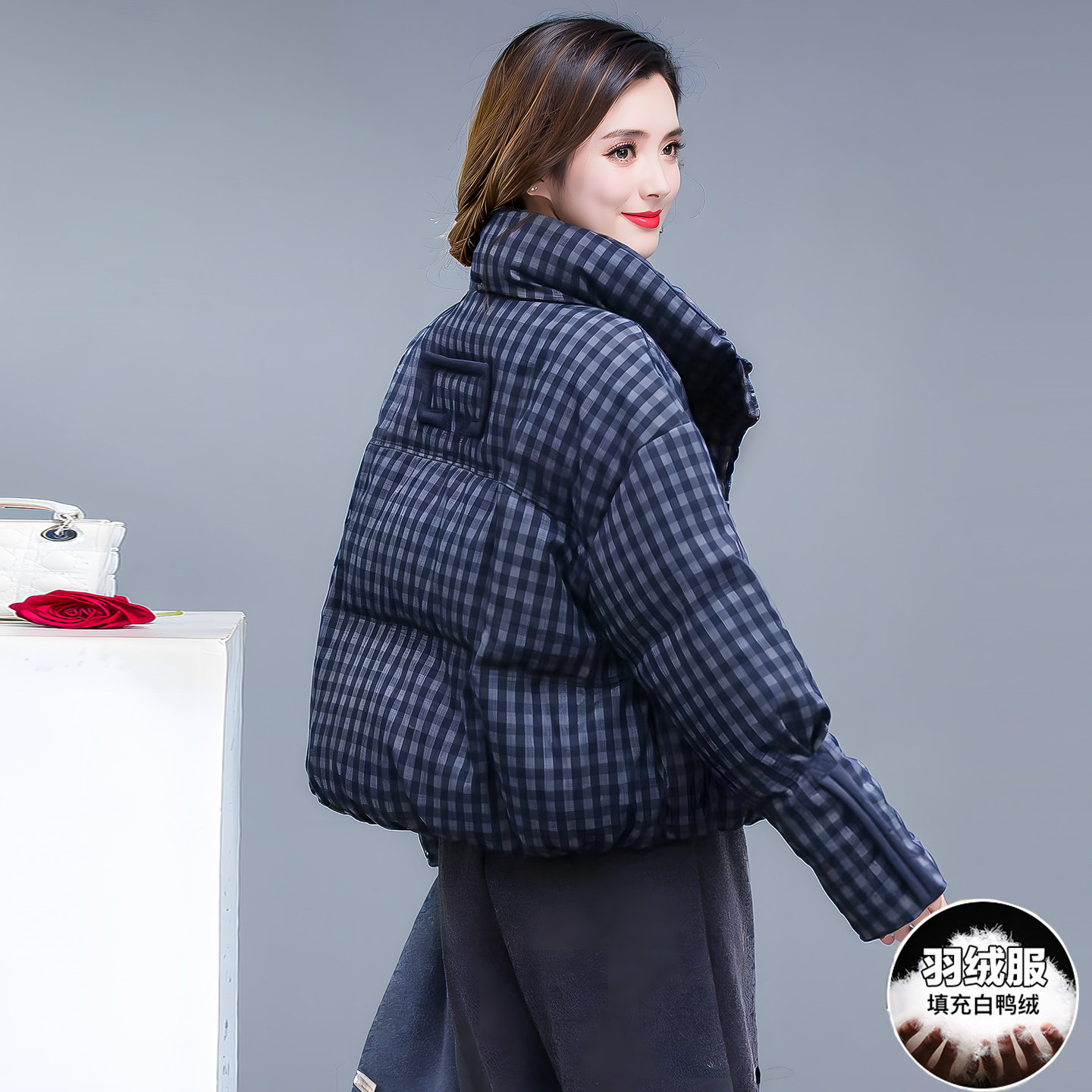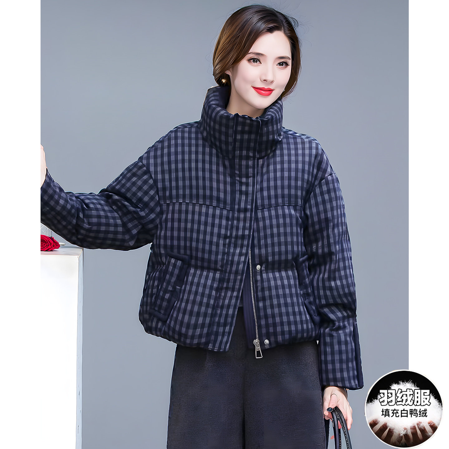 📚 今年流行格子短款羽绒服女冬新款立领加厚保暖宽松减龄白鸭绒外套