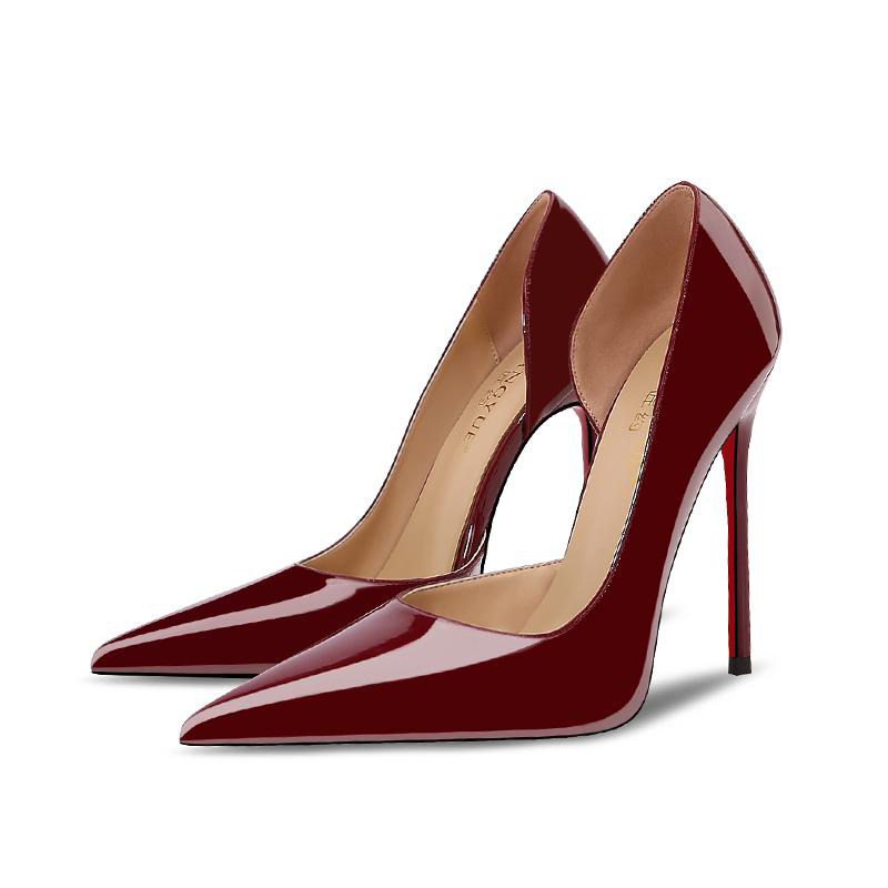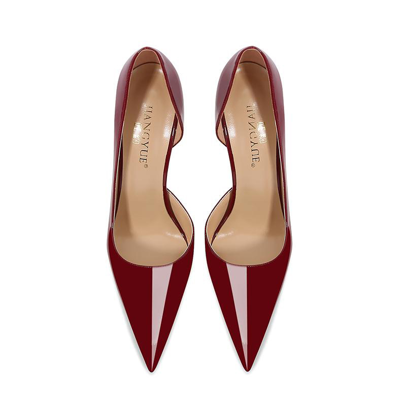 📚 2026新款酒红色漆皮红底侧空高跟鞋女尖头细跟浅口性感大码单鞋女