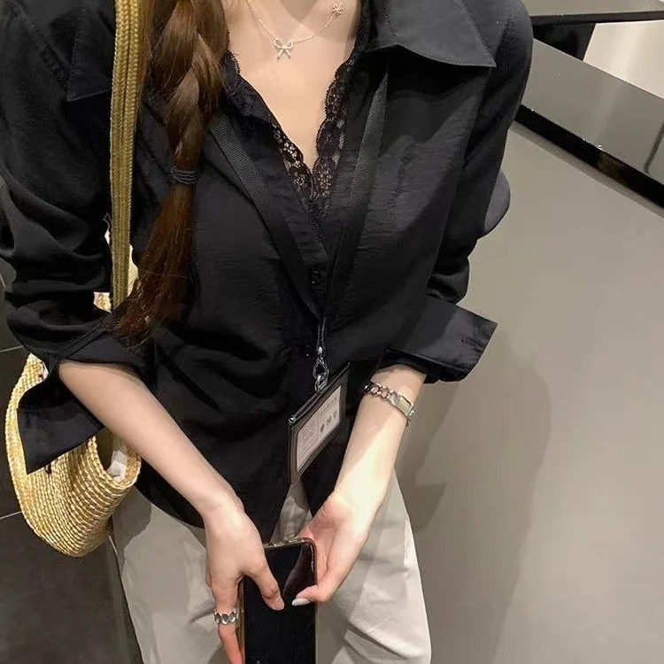 📚 韩系长袖翻领蕾丝白色衬衫女春夏新款叠穿设计感显瘦收腰外穿上衣
