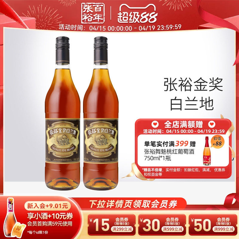 📚 【张裕官方】金奖白兰地700ml*2洋酒38.5度可乐桶调酒正品官旗