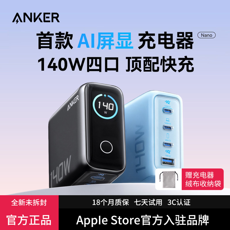 📚 Anker安克140W屏显氮化镓充电器适用华为苹果17数显充电头iphone16手机平板电脑Macbook笔记本PD100W多口快充