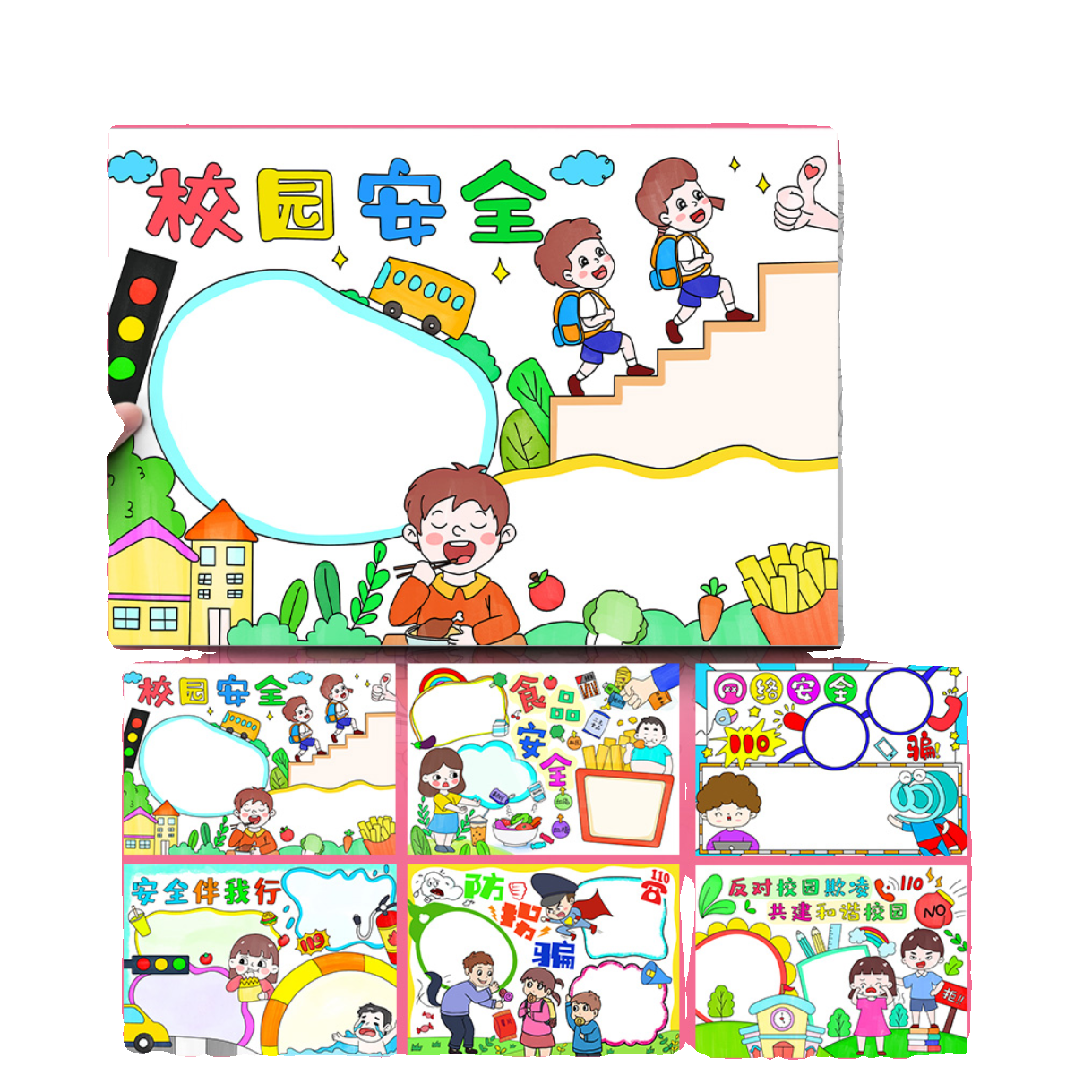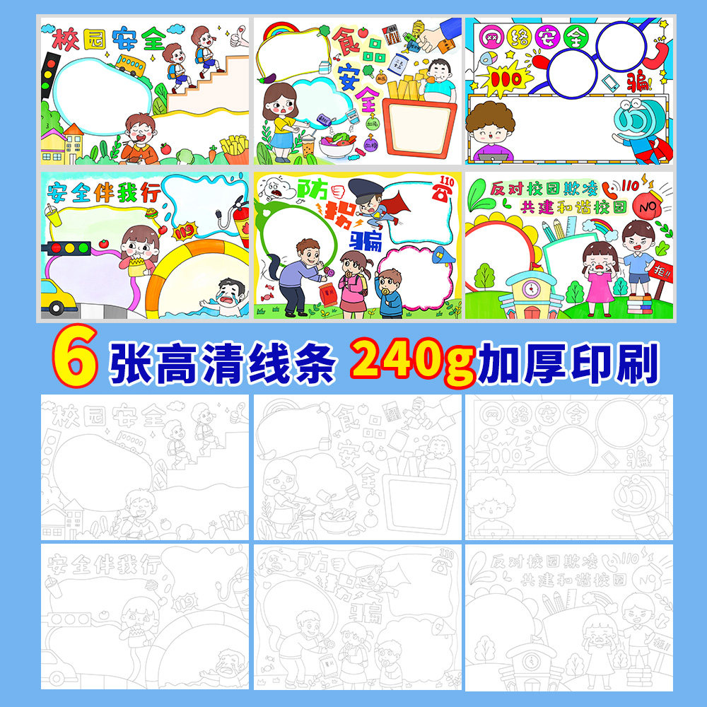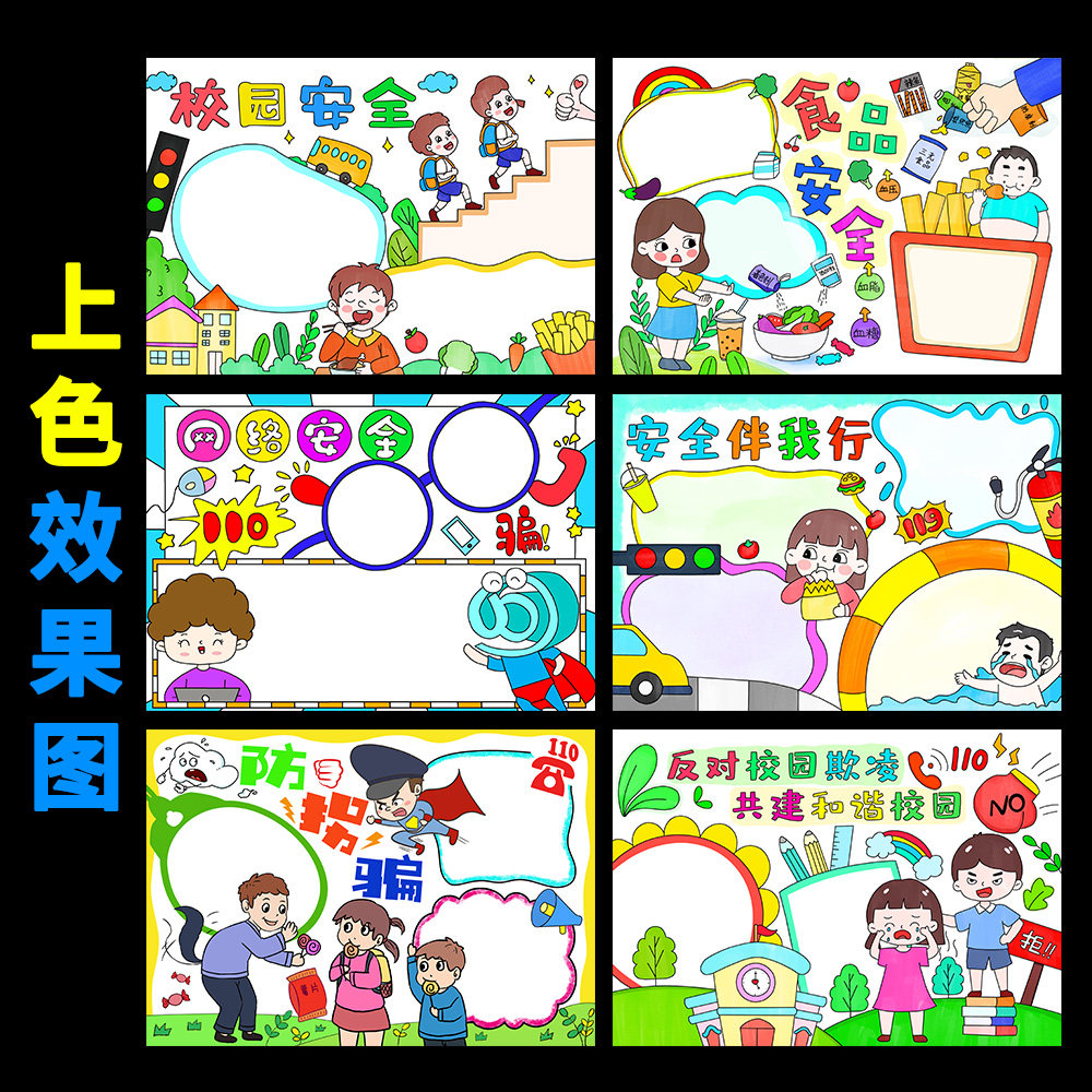 📚 校园安全手抄报防欺凌食品安全防拐骗网络安全半成品涂色小报