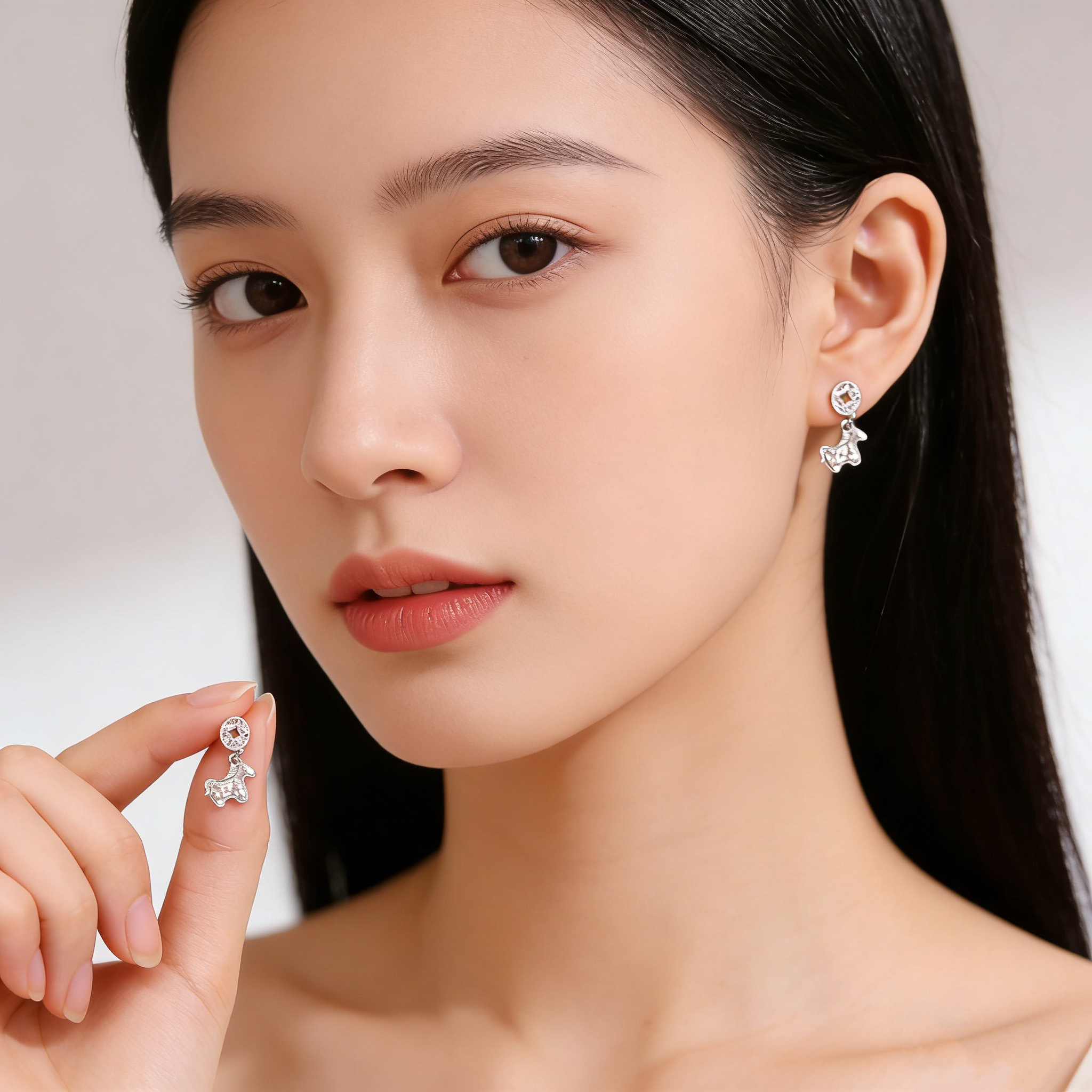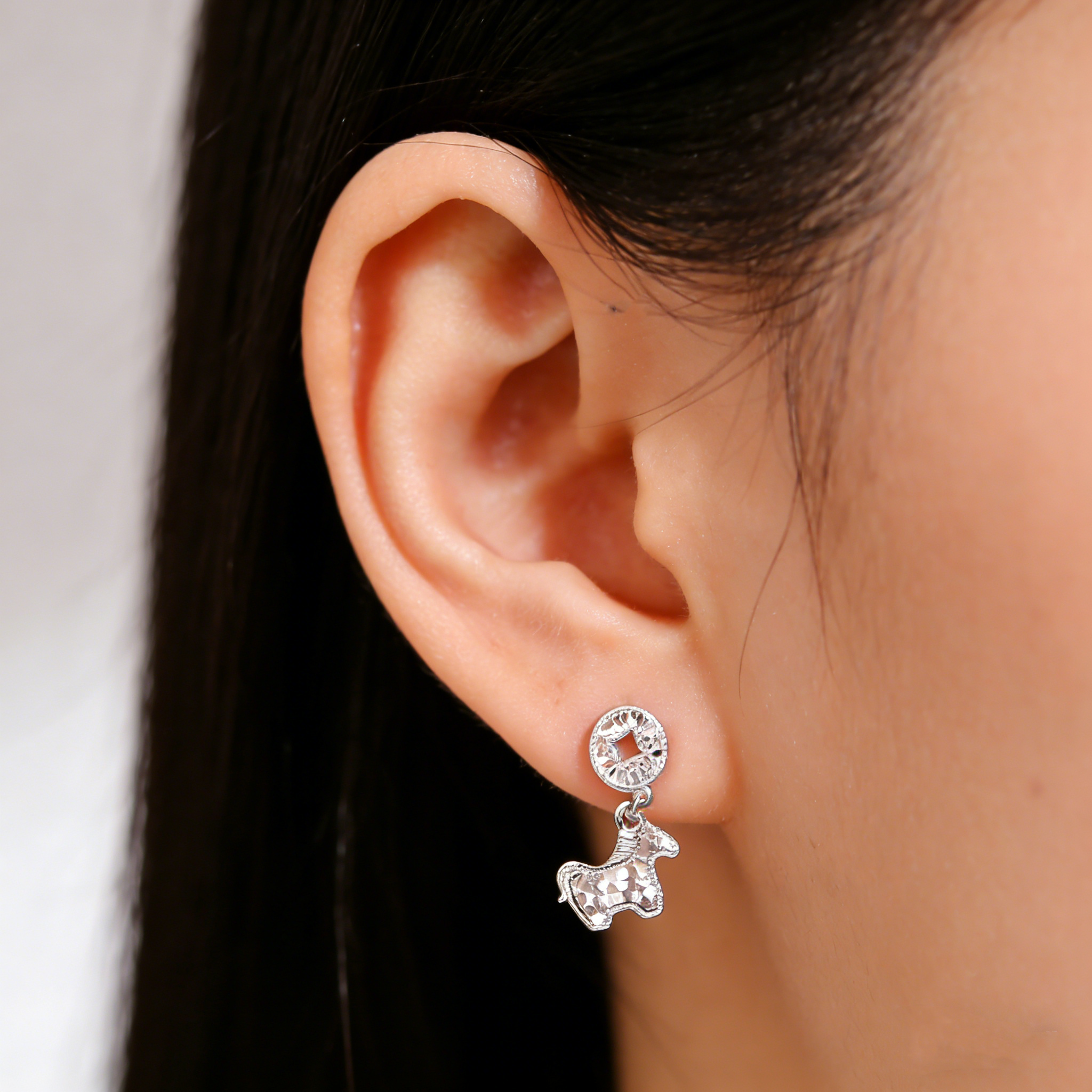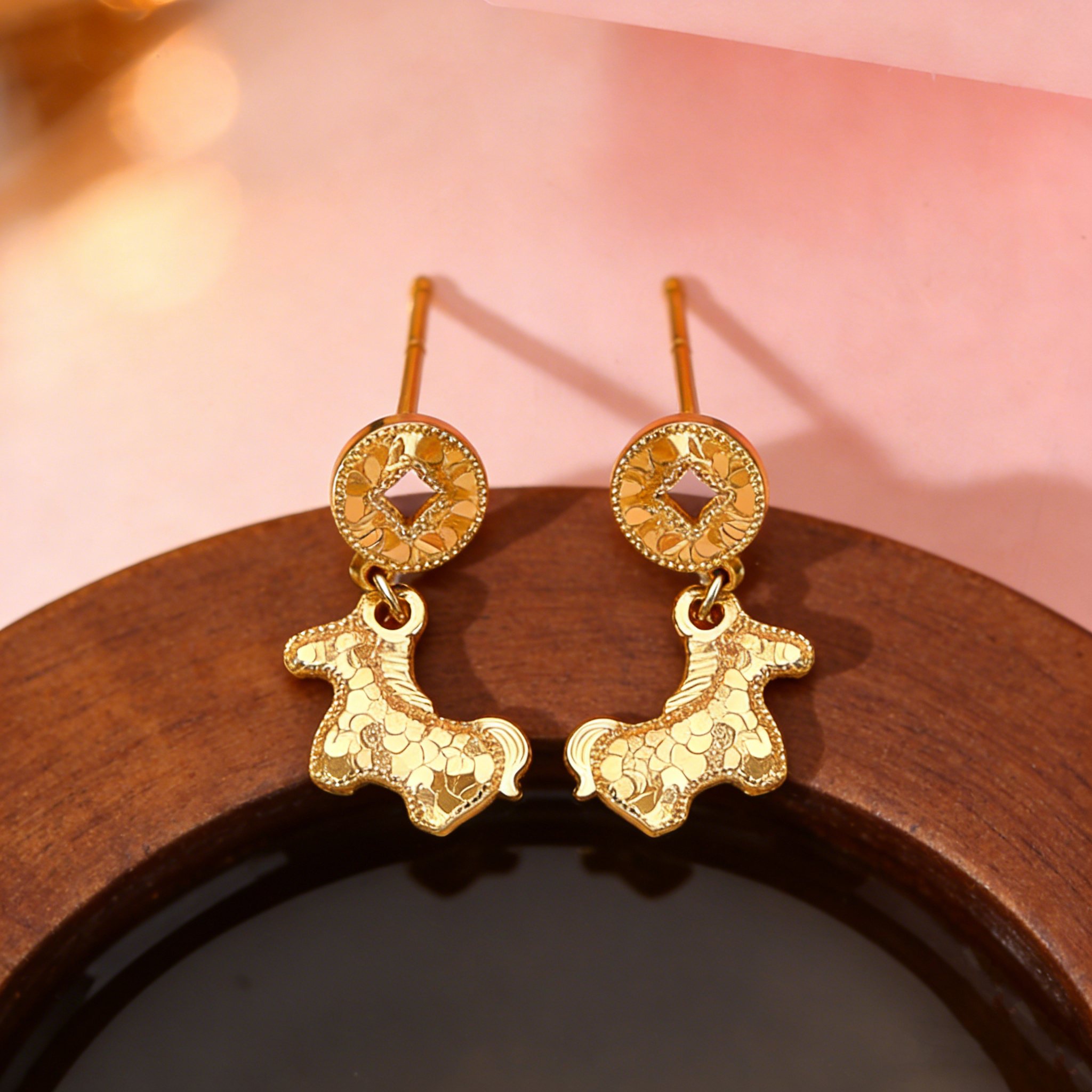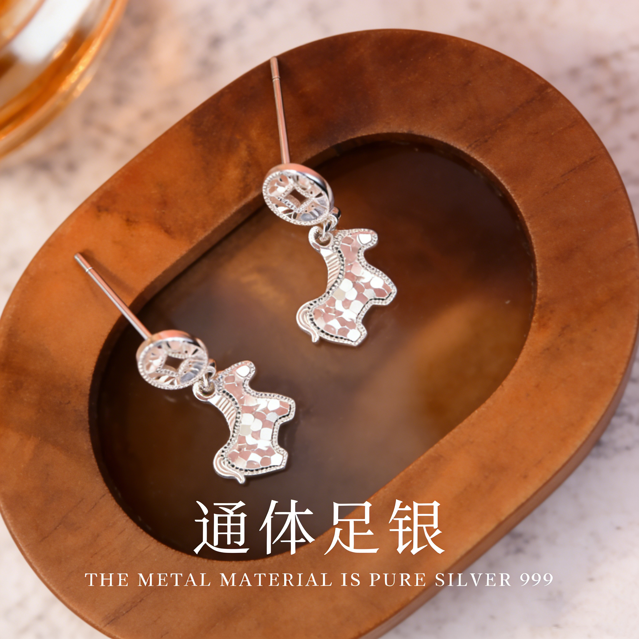 📚 足银S999碎冰冰马上有钱耳钉纯银新款本命年招财铜钱小马耳饰送礼