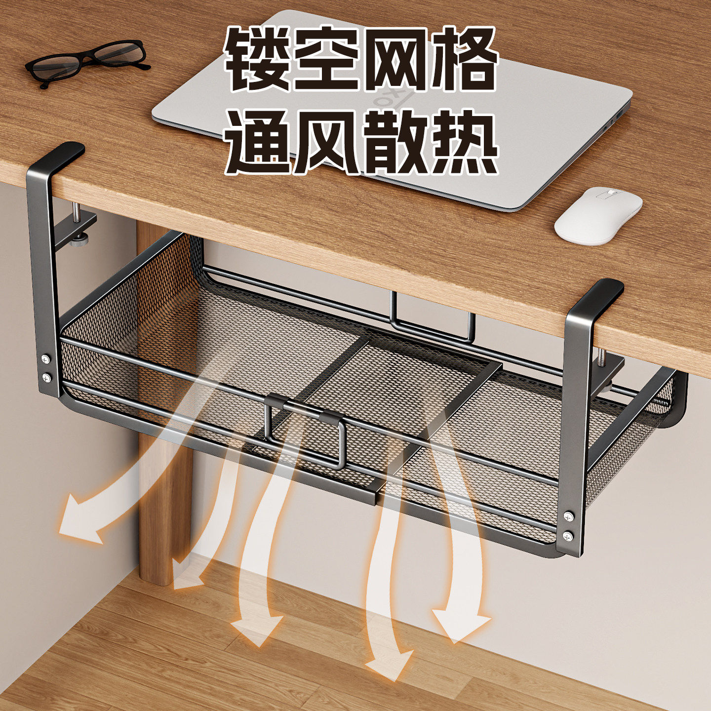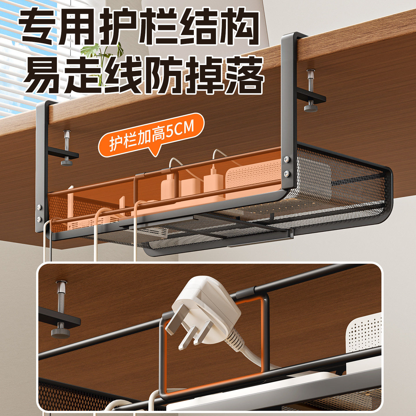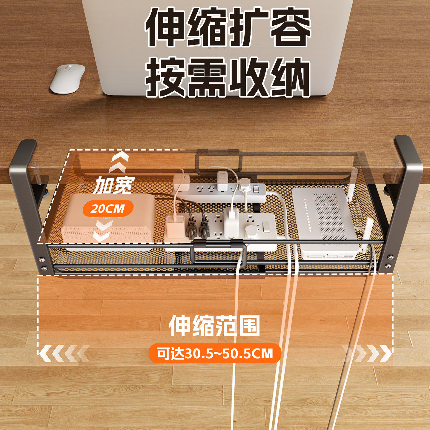 📚 免打孔桌下置物架理线器办公桌底挂篮路由器放置架插排数据线收纳