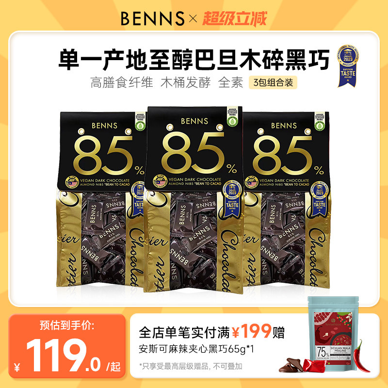 📚 BENNS贝纳丝85%黑巧克力坚果巧克力巴旦木黑巧休闲零食138g*3包