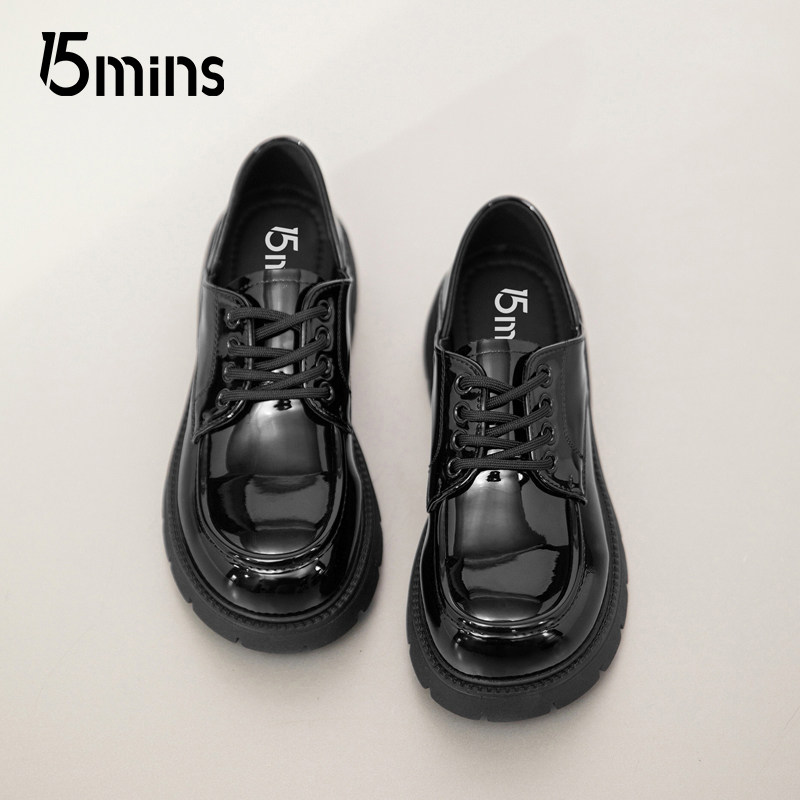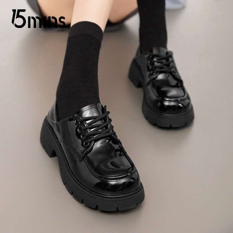 📚 15mins黑色小皮鞋女款2025新款夏季厚底亮面系带单鞋英伦风乐福鞋