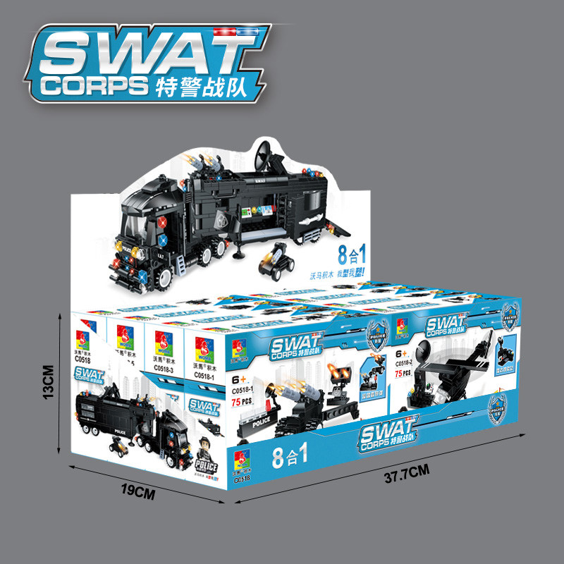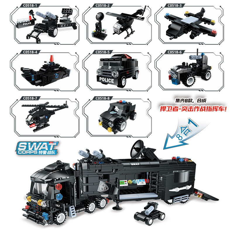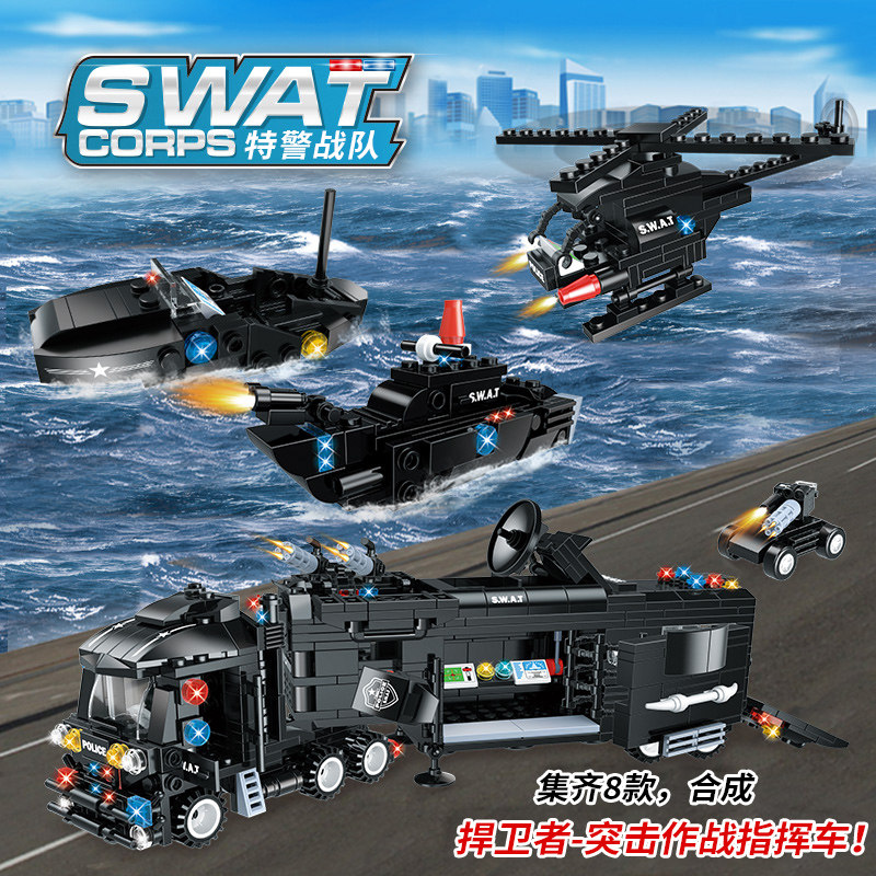 📚 沃马积木 益智力拼装玩具特警战队8合1捍卫者突击作战指挥车C051.