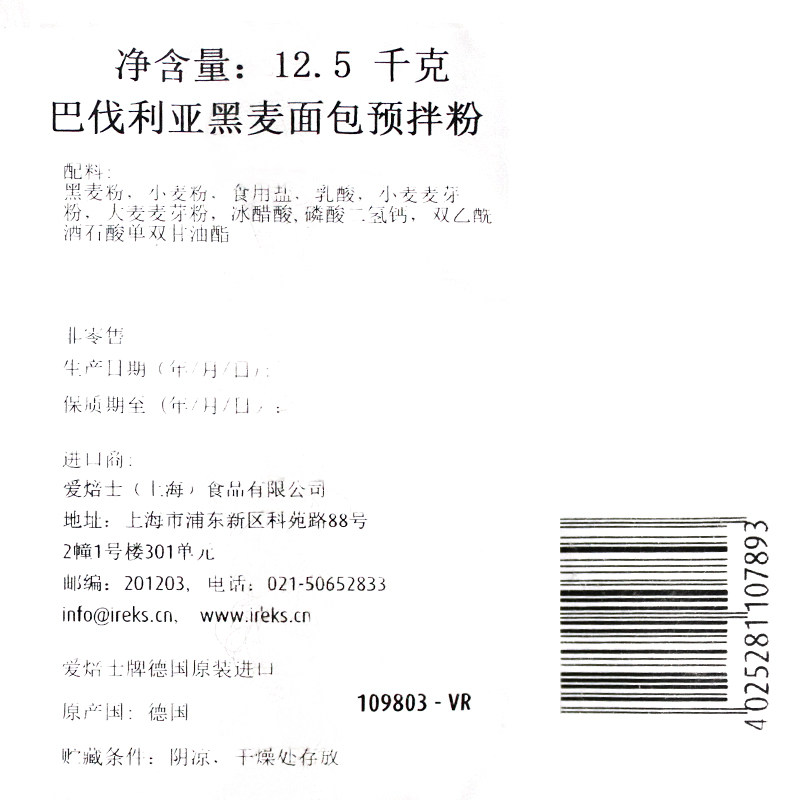 📚 爱焙士巴伐利亚黑麦面包预拌粉12.5kg 德国进口面粉西点烘焙DIY