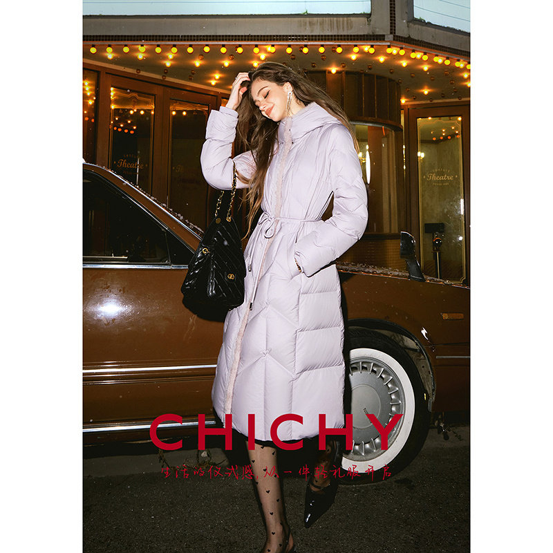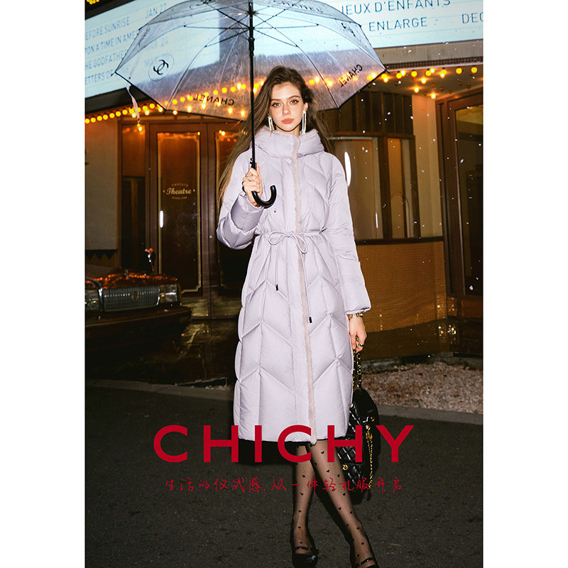 📚 【90%鹅绒】CHICHY白色长款连帽收腰羽绒服女25冬季新款保暖外套