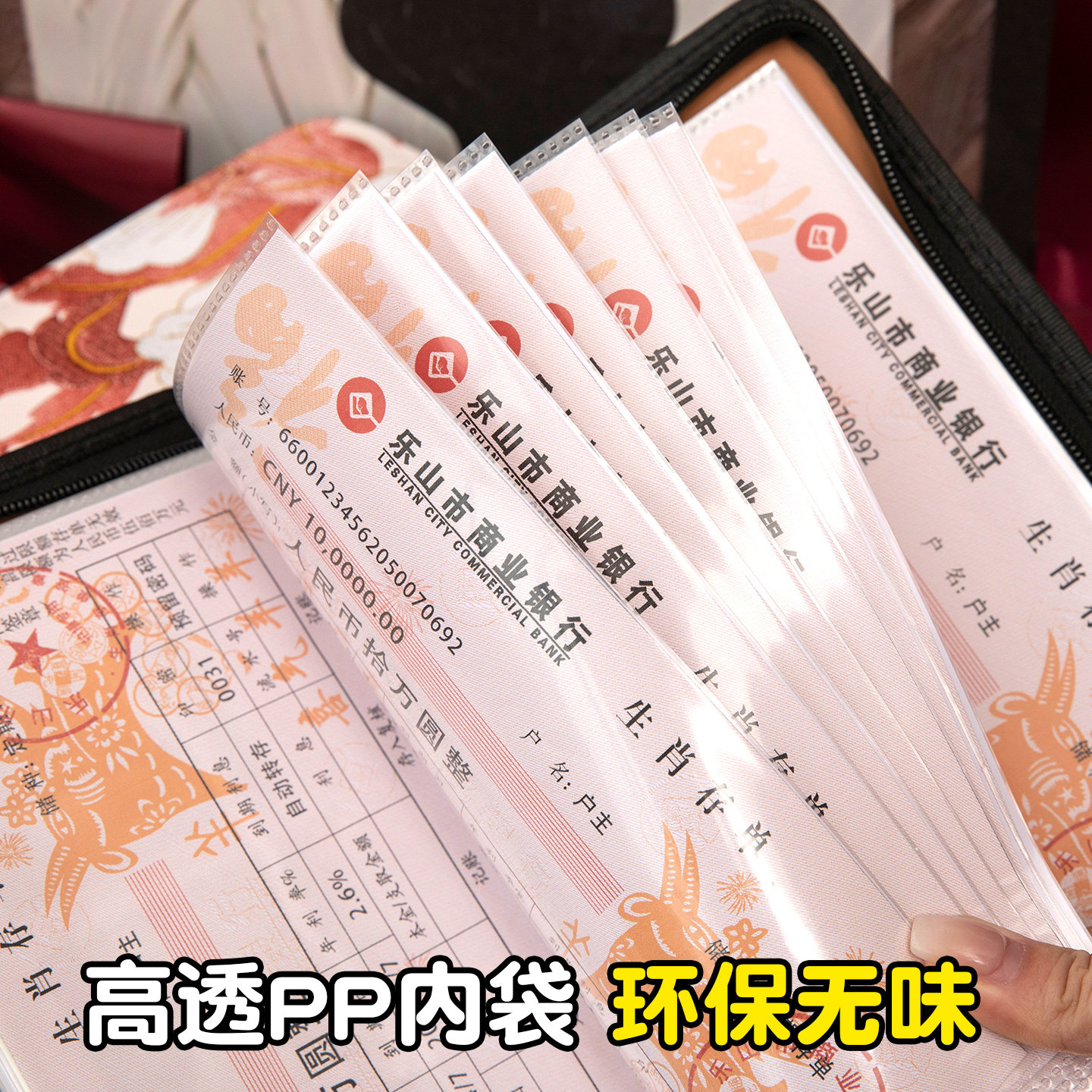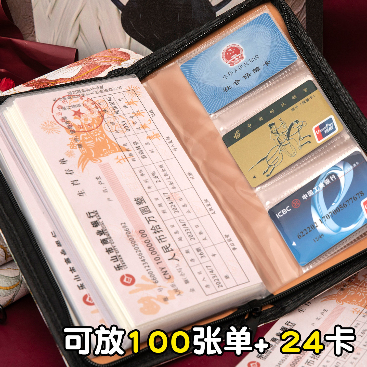 📚 2026年新款拉链刺绣牡丹花纹定期存单专用夹收纳本银行纸质一体包大容量防水存折支票多功能票据存折收纳册