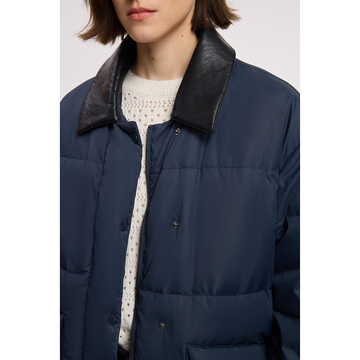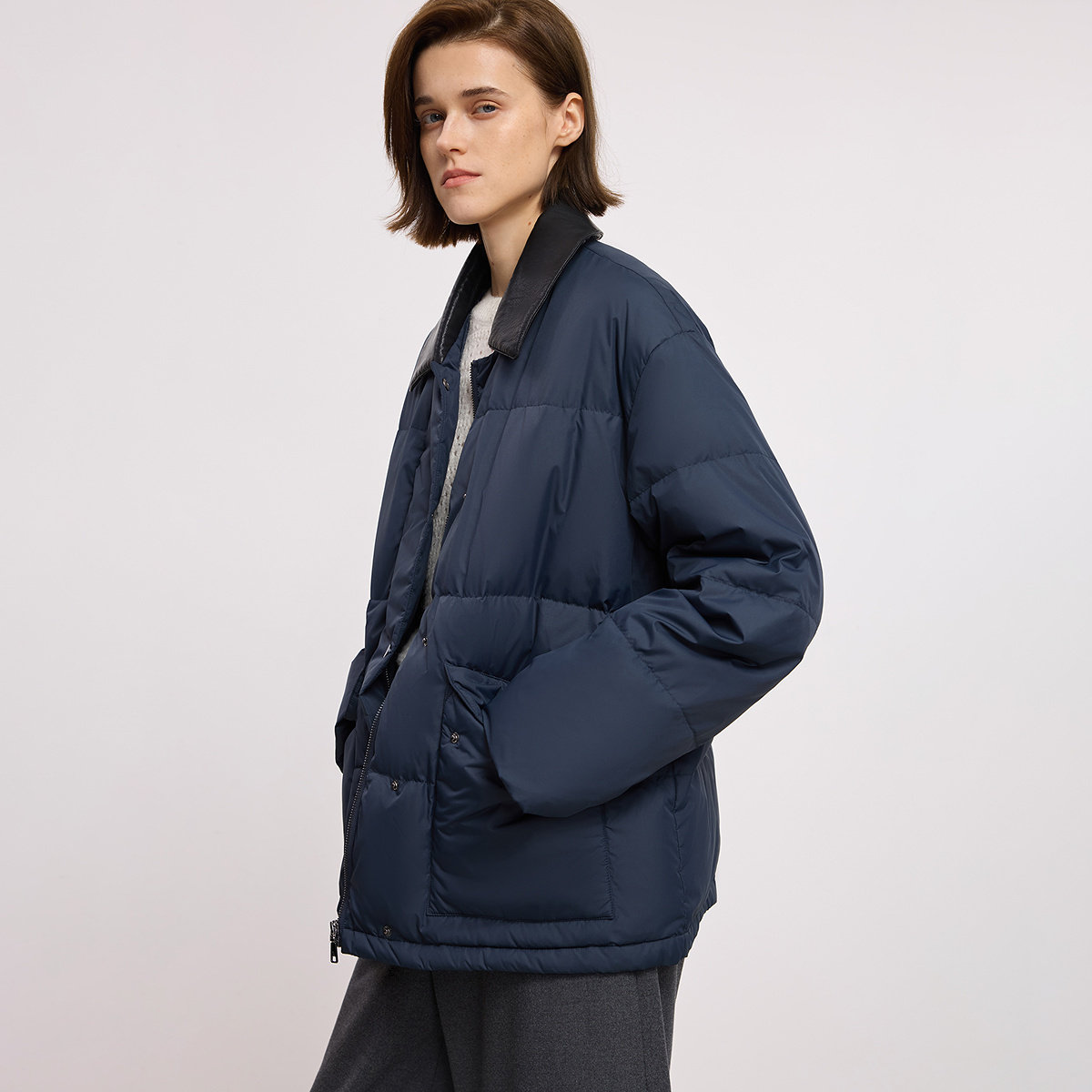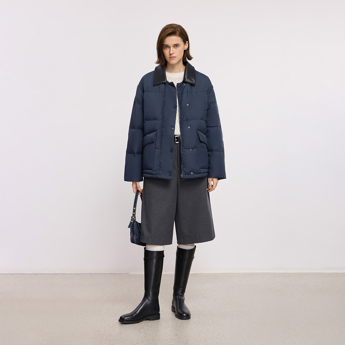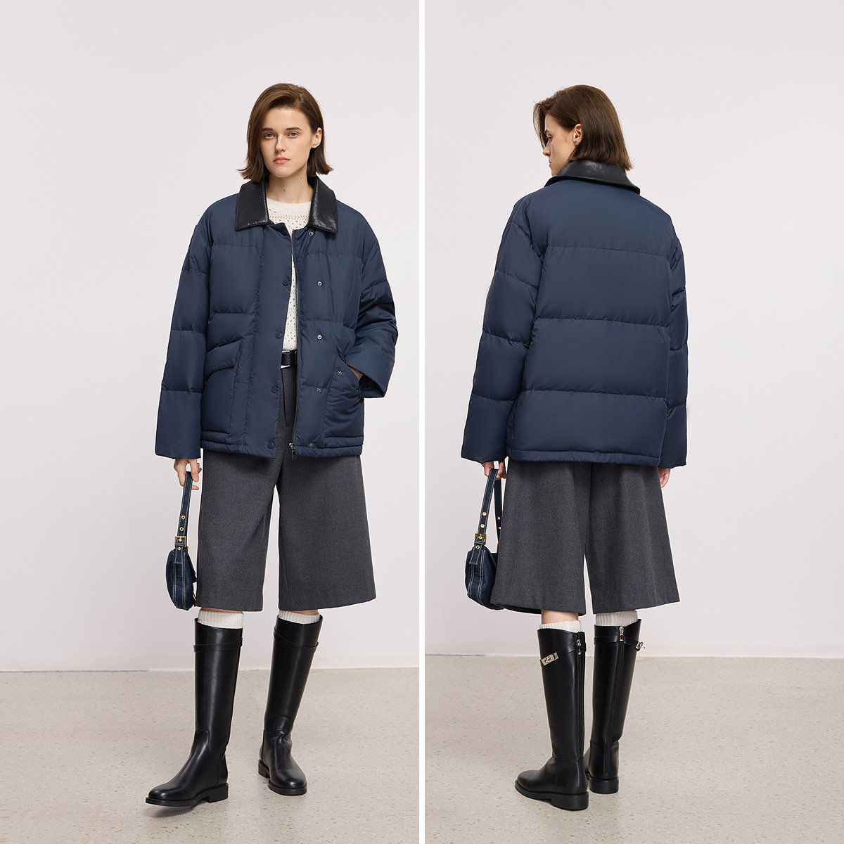 📚 LILY冬新款老钱风拼接翻领90鸭绒泡芙藏青色羽绒服外套女短款