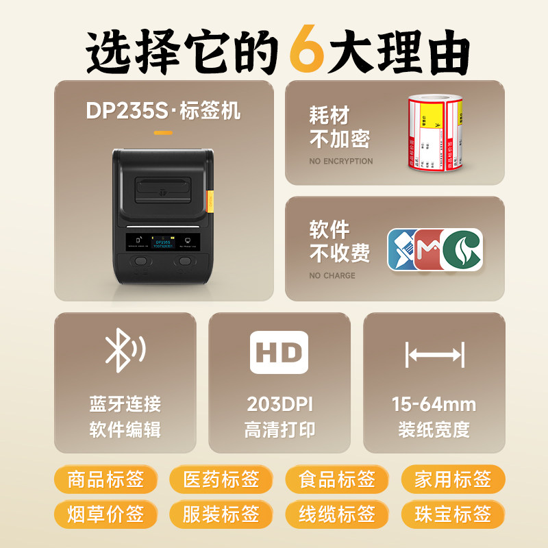 📚 德佟DP235S标签打印机茶叶标签普洱茶茶饼不干胶贴纸茶罐牛皮纸标签彩色古风封口贴纸订制商标食品小型标签机