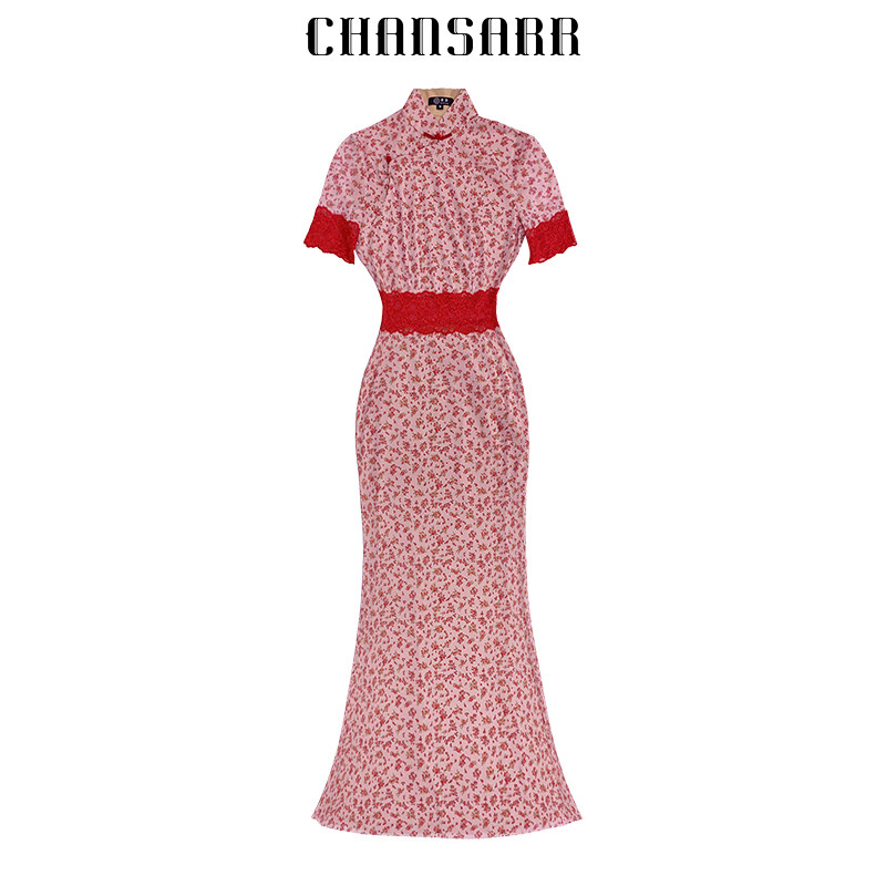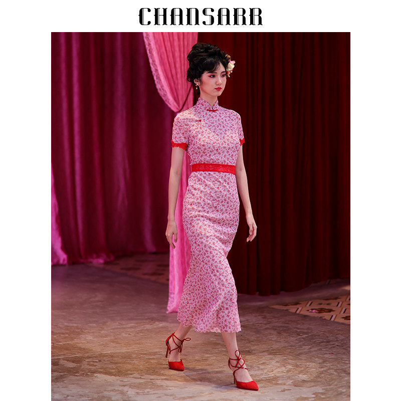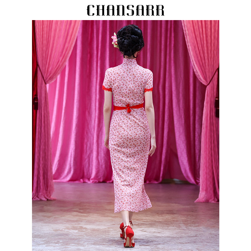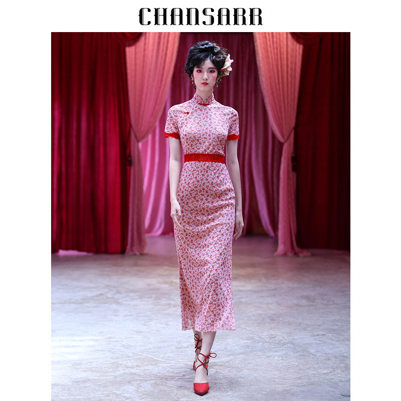 📚 香莎 碎花弹力网纱撞色怀旧复古经典旗袍