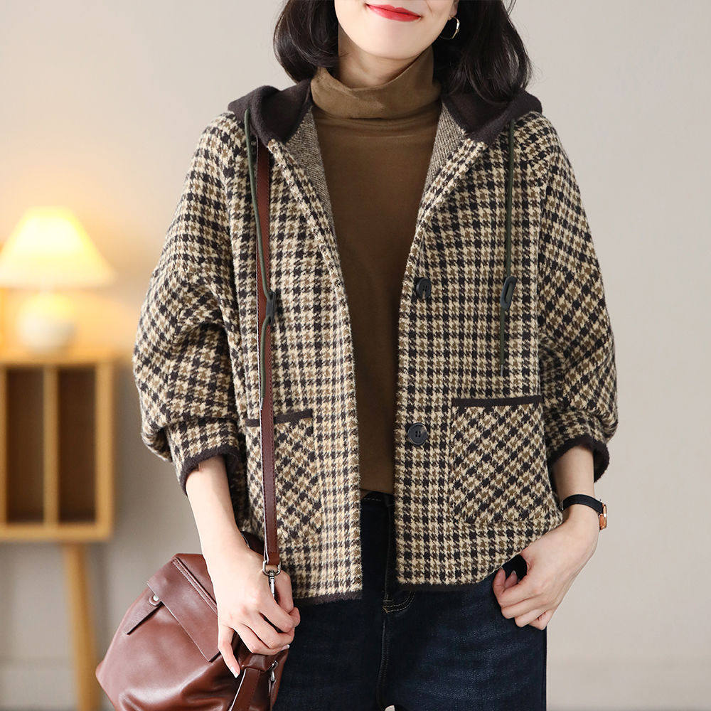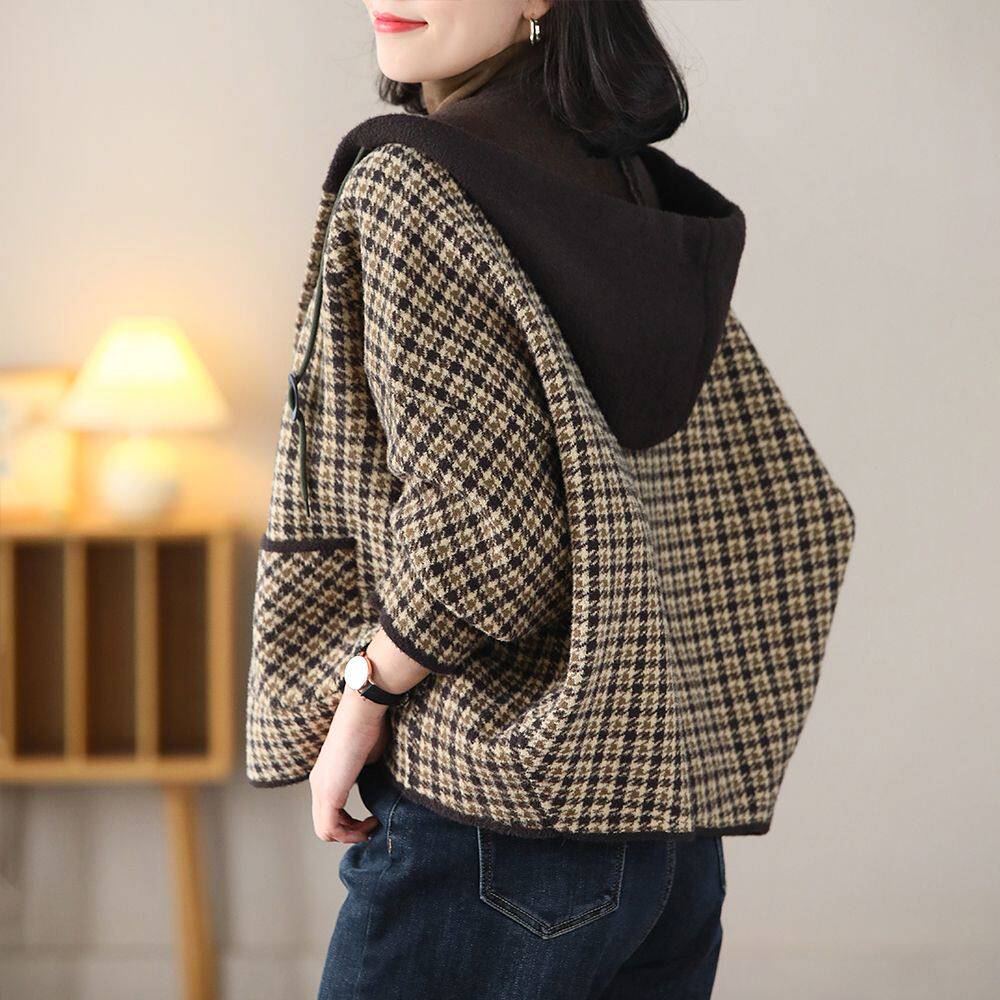 📚 铜扣记千鸟格外套女大码宽松文艺百搭韩版显瘦千柔绒气质连帽长袖