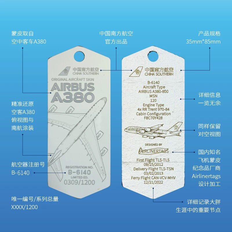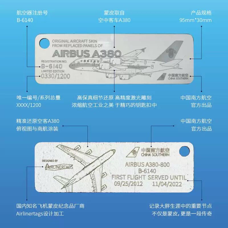 📚 中国南方航空A380-800飞机蒙皮B6140空客大胖钥匙扣收藏民航挂件