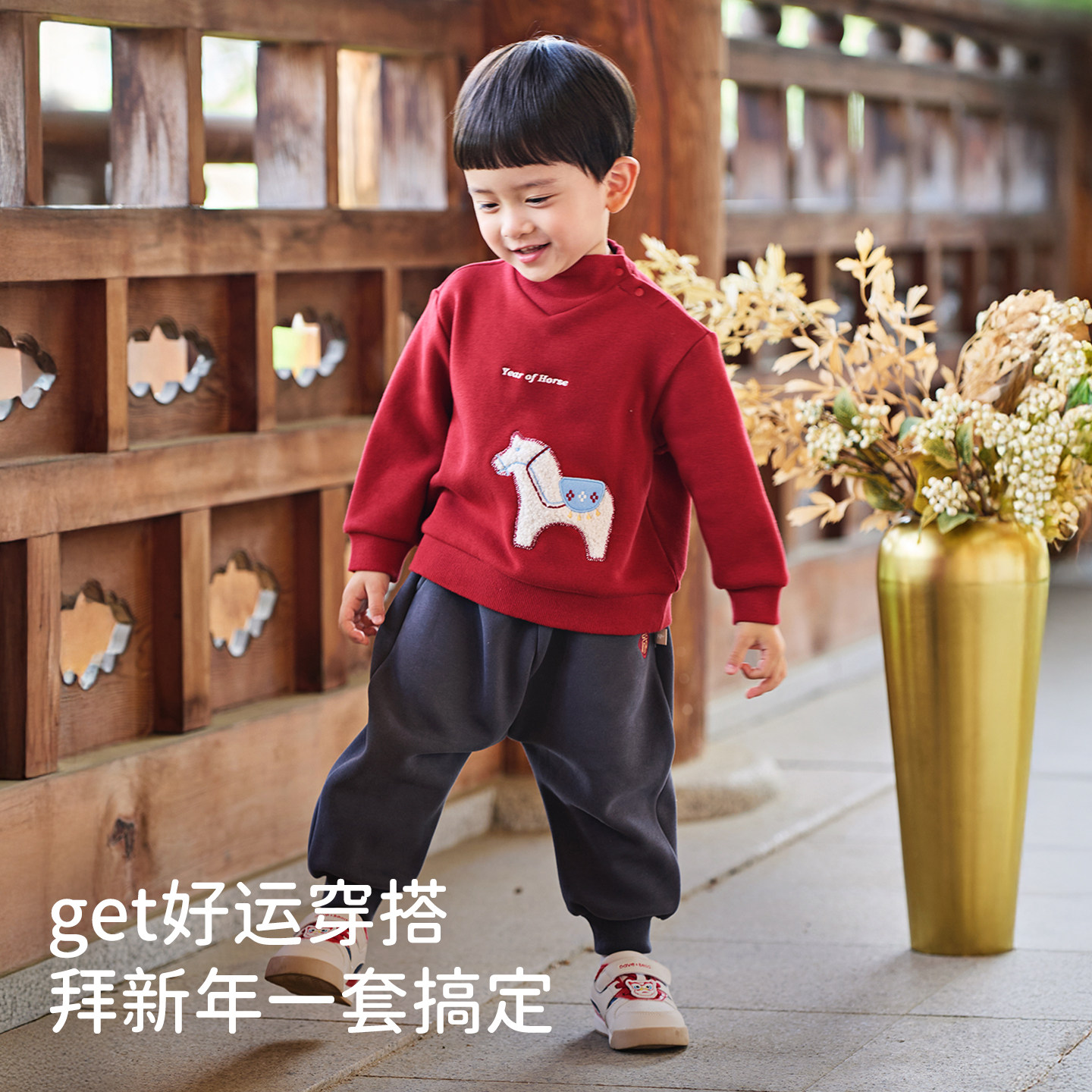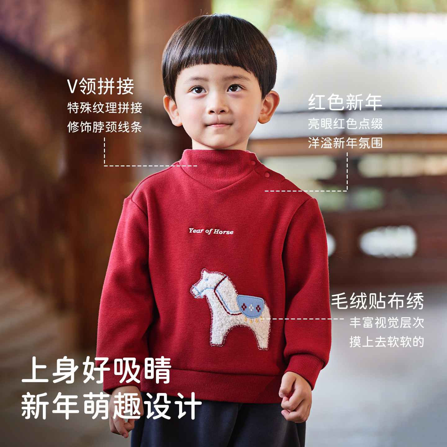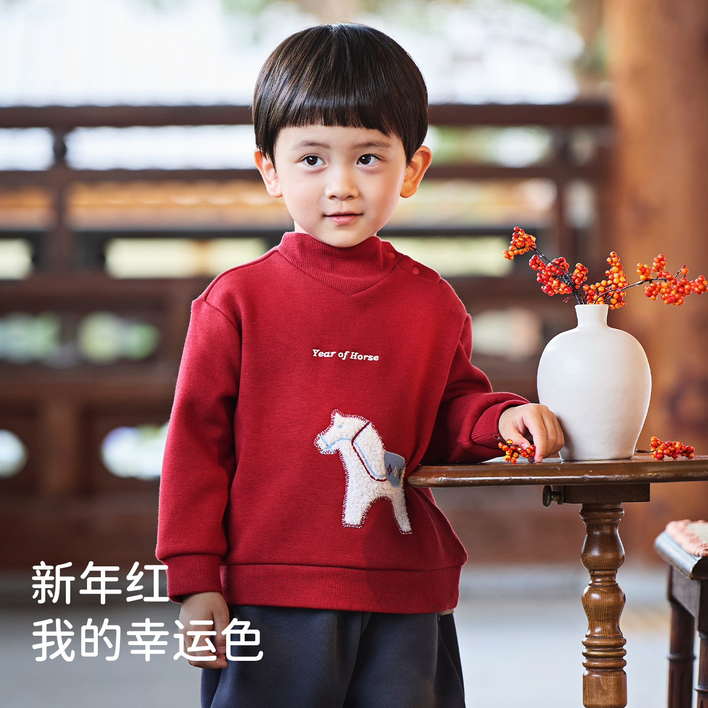 📚 戴维贝拉儿童不倒绒卫衣2026冬装男童加绒新年红色半高领保暖上衣