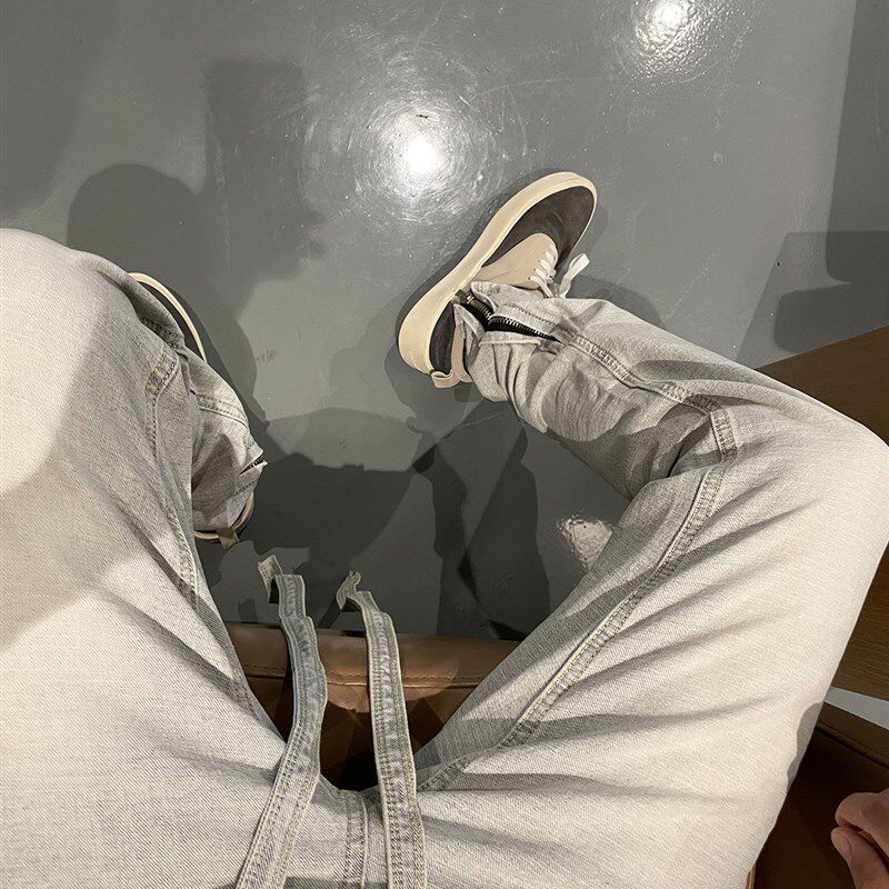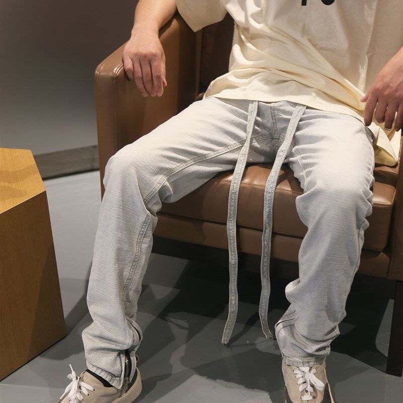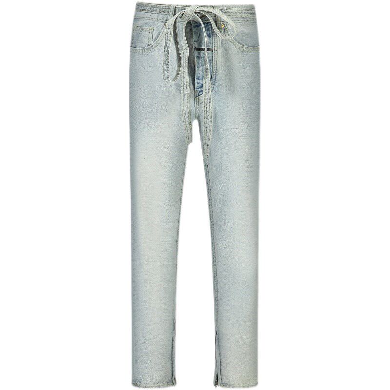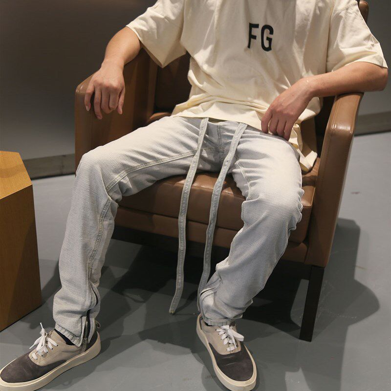 📚 FOG高品质6TH浅蓝色抽绳飘带修身小直筒做旧反水洗侧拉链牛仔裤潮