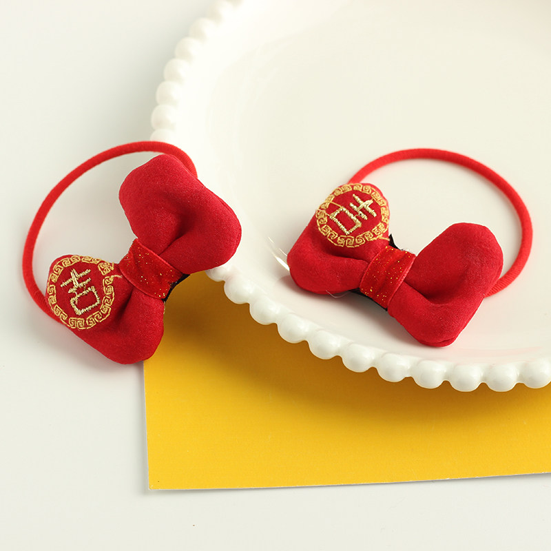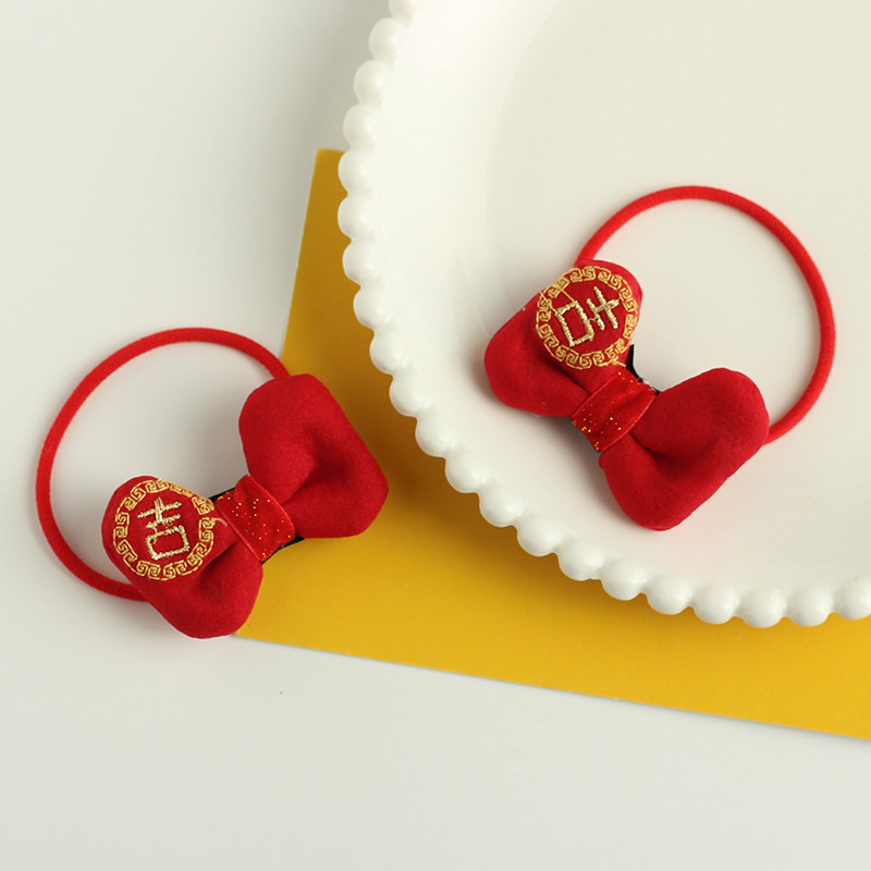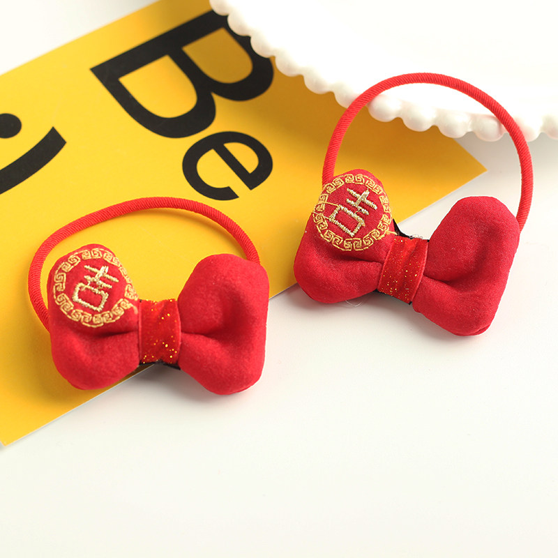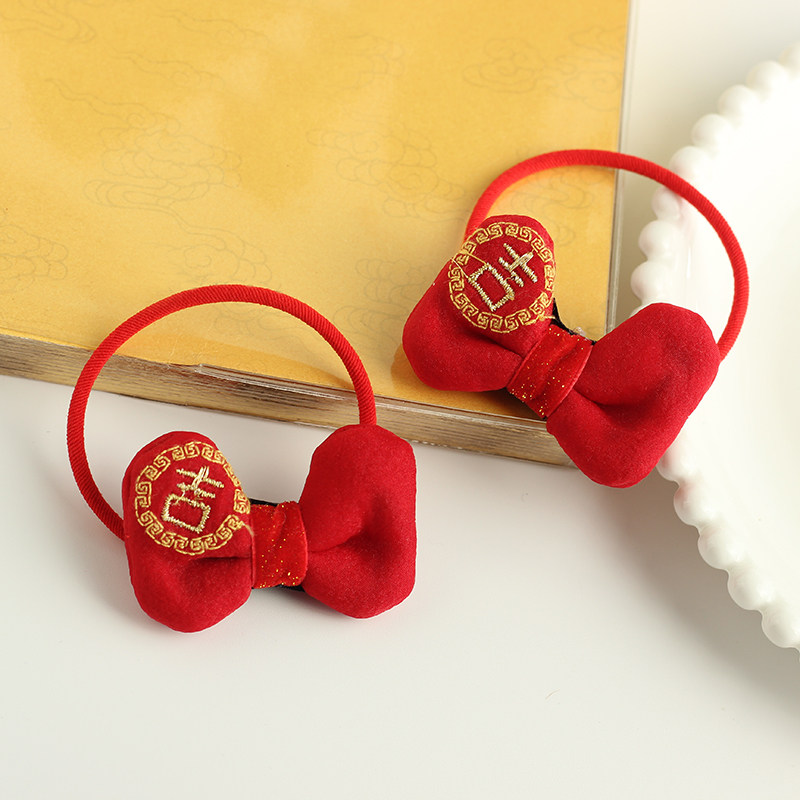 📚 高档刺绣新年红头绳红色蝴蝶结发圈中国风吉祥如意发绳过年发饰品