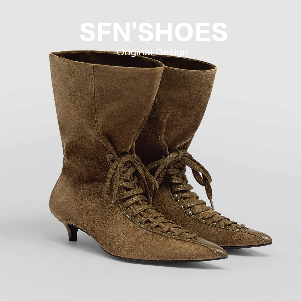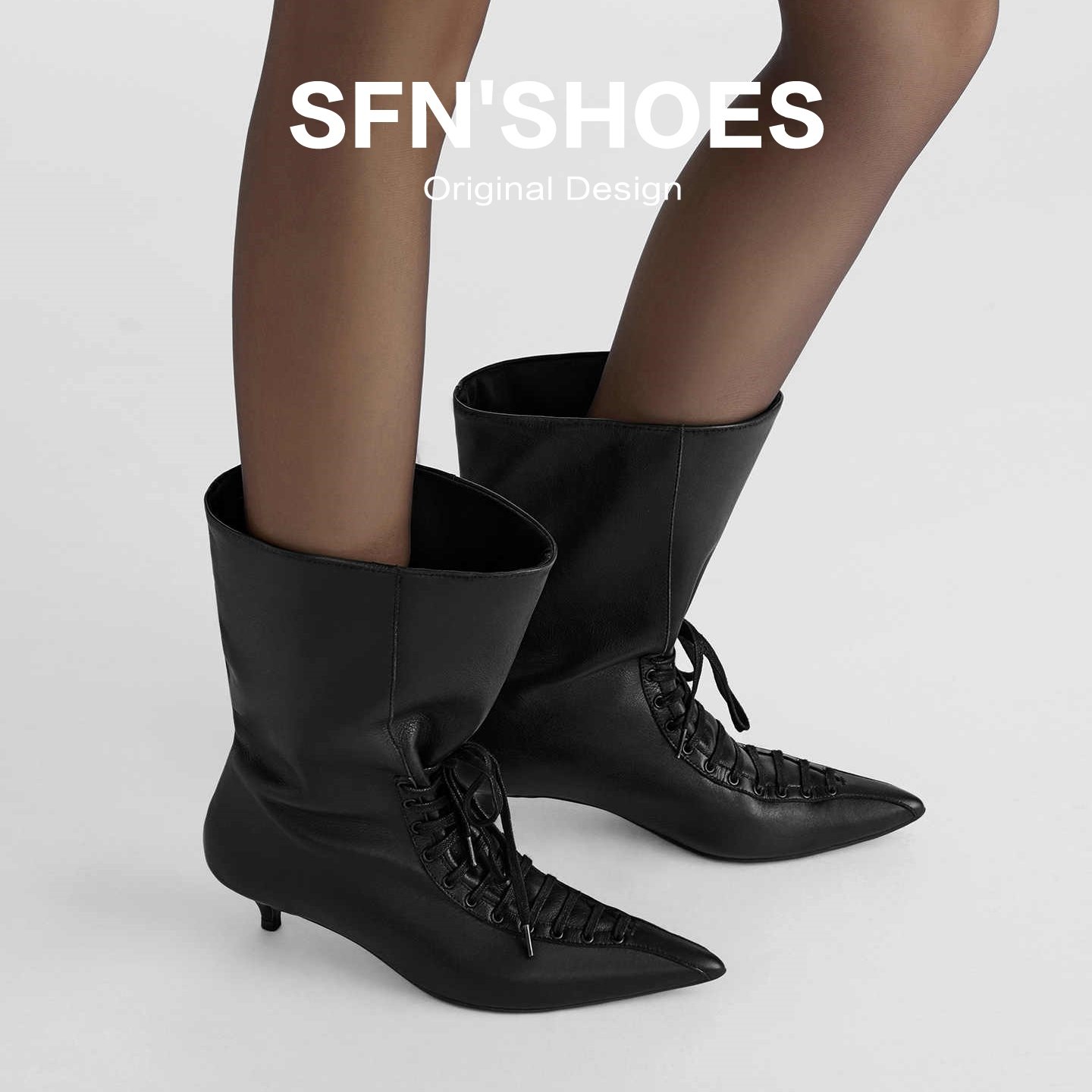 📚 羊皮版~小众尖头绑带女巫靴黑色细跟高跟短靴大筒围中筒瘦瘦靴子