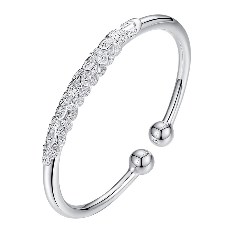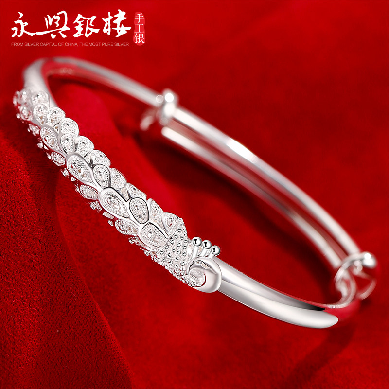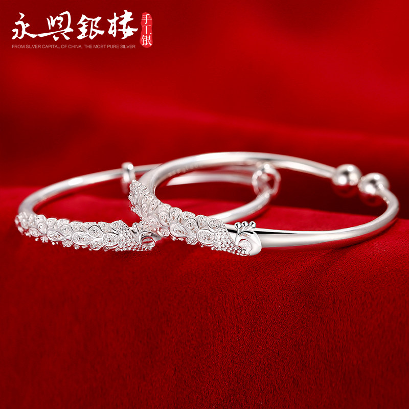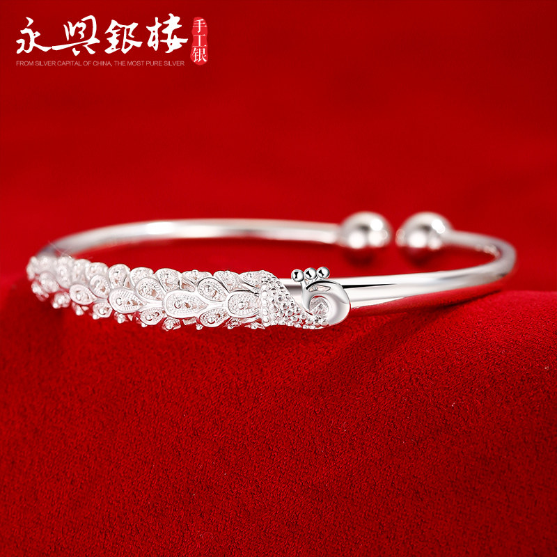 📚 永兴银楼999纯银手镯女孔雀雕花银手环开口民族风蒜头时尚足银镯