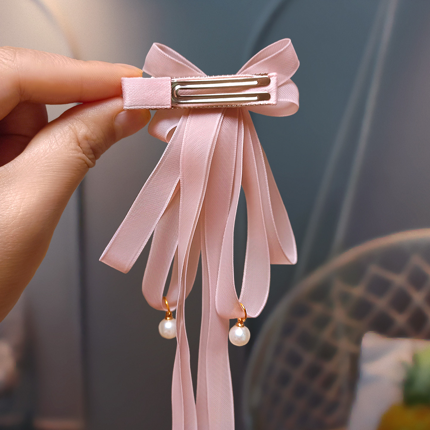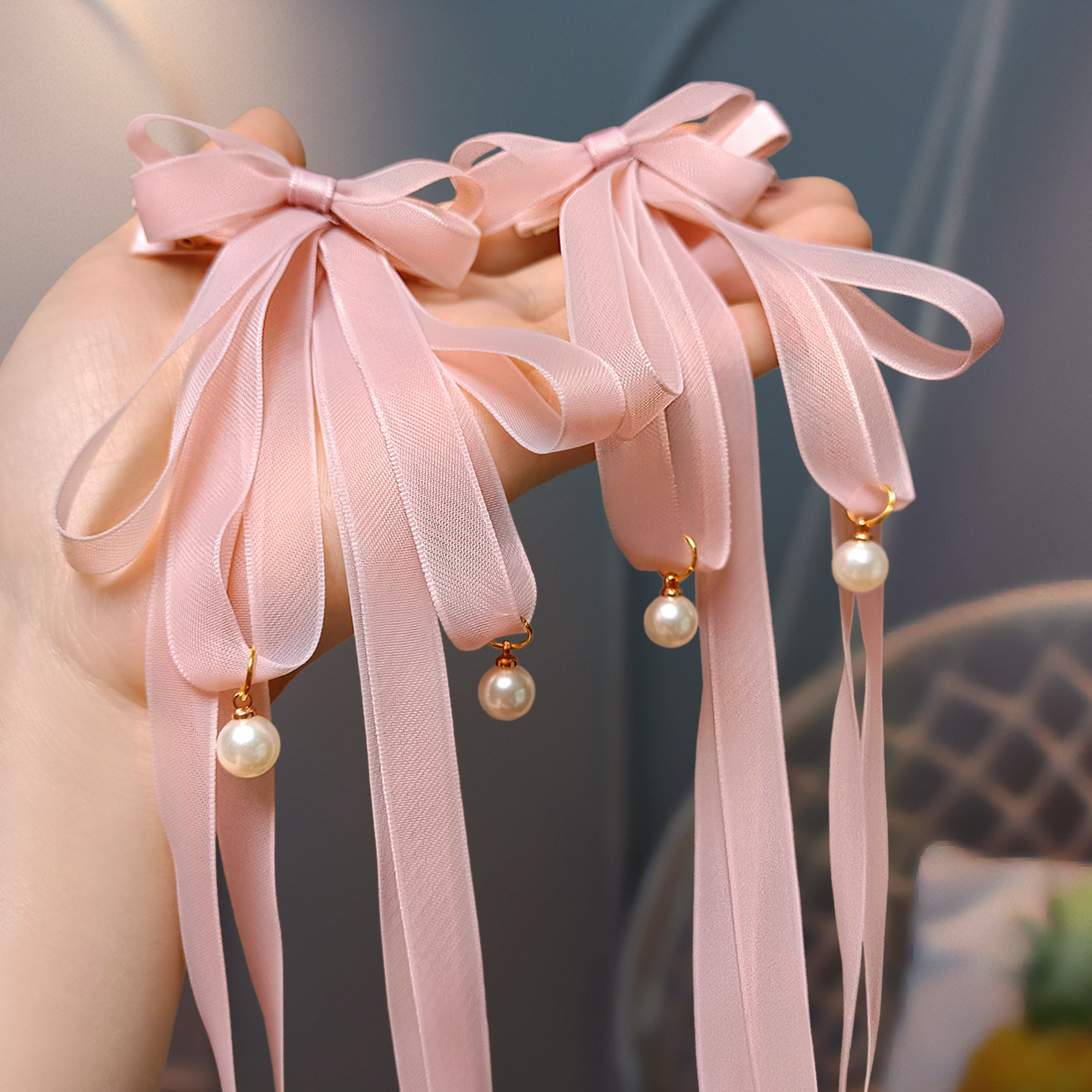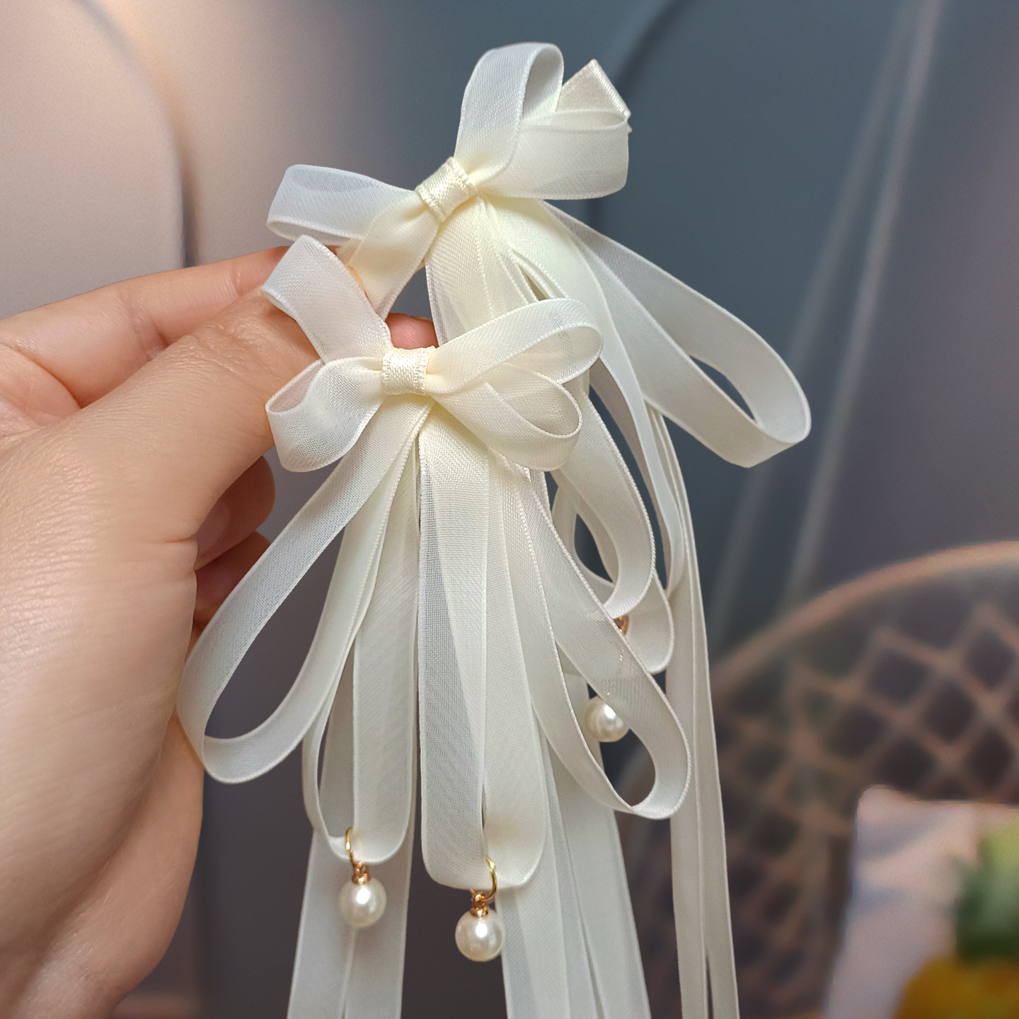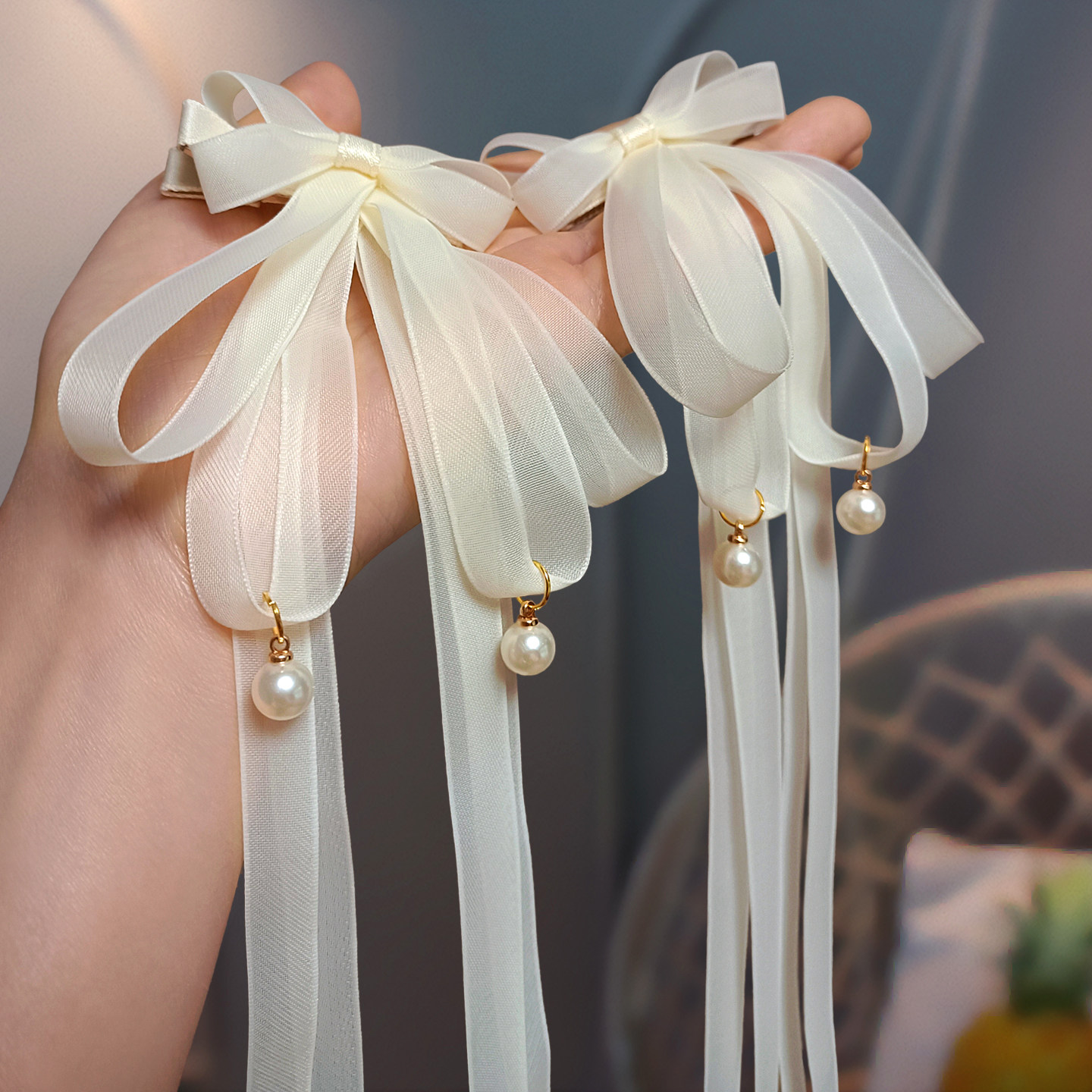 📚 儿童仙气头花小女孩编辫子长飘带珍珠网纱蝴蝶结发夹流苏汉服对夹