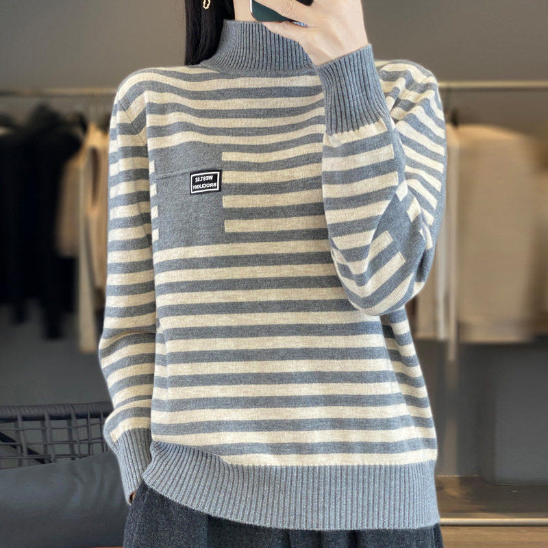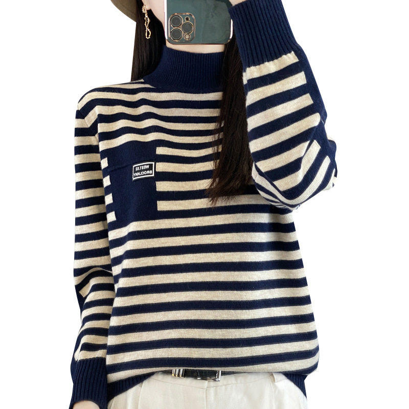 📚 名佳怡女装法式轻奢条纹毛衣秋冬女士高领套头打底衫洋派翻领上衣